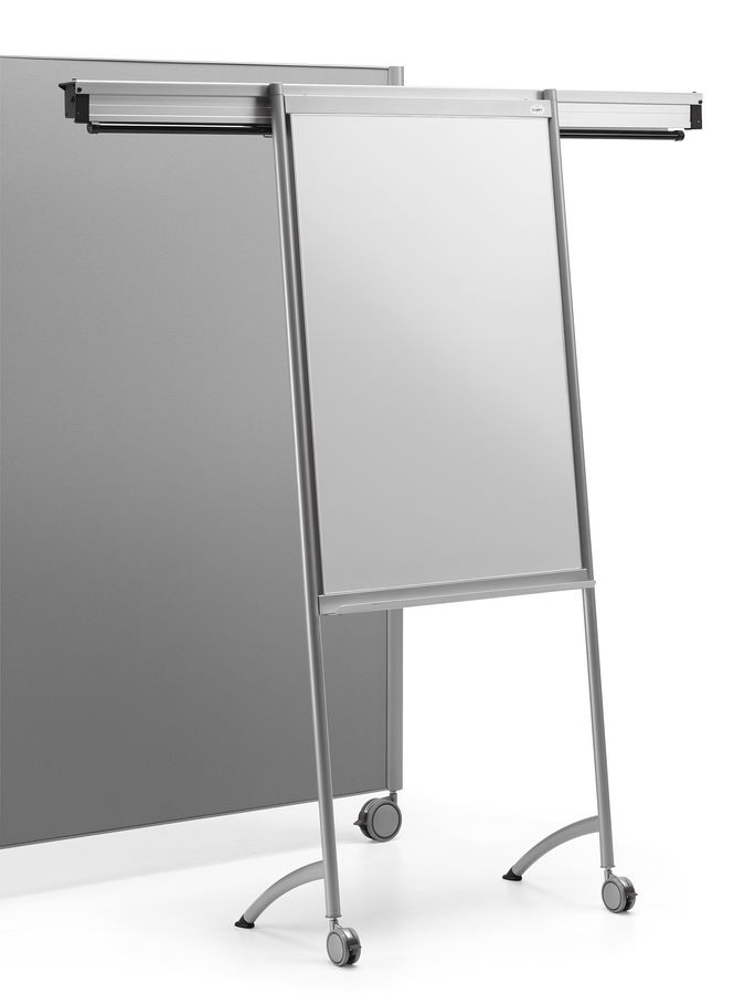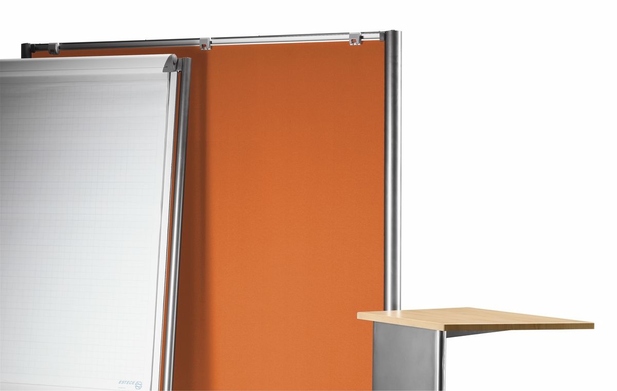Ecran sur roulettes avec surface nettoyable et structure en acier vernie.
