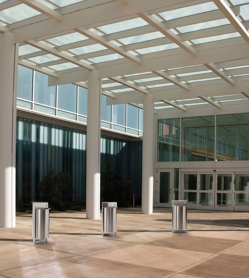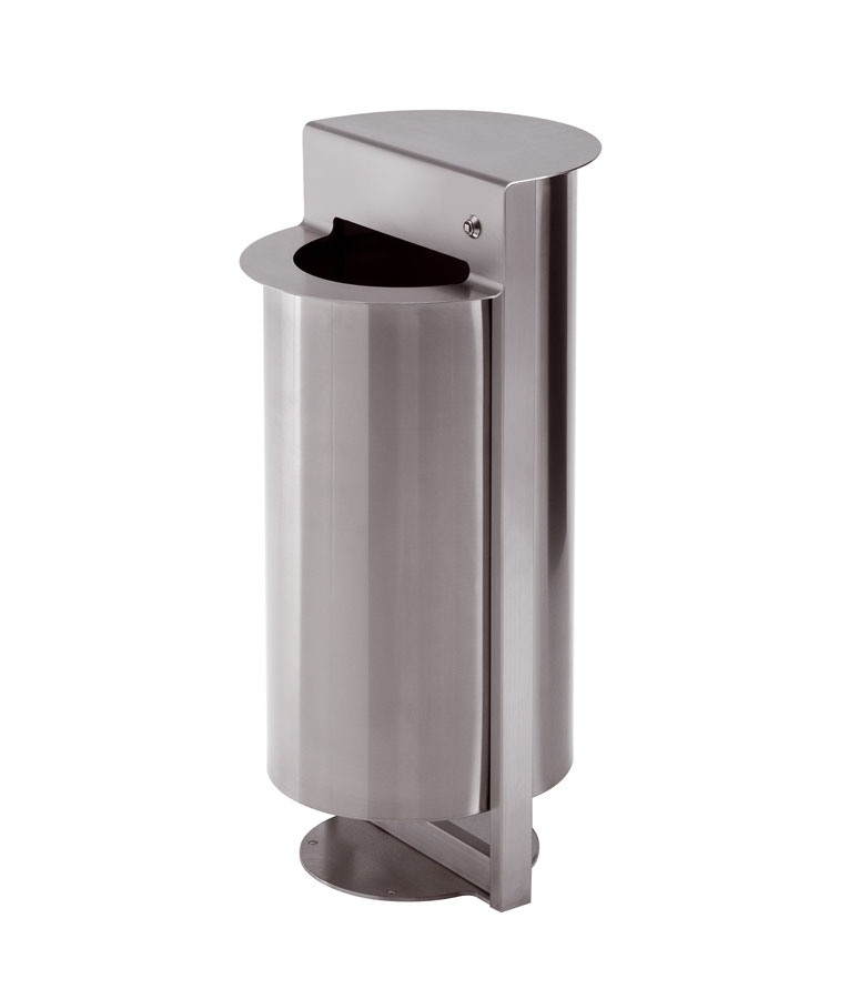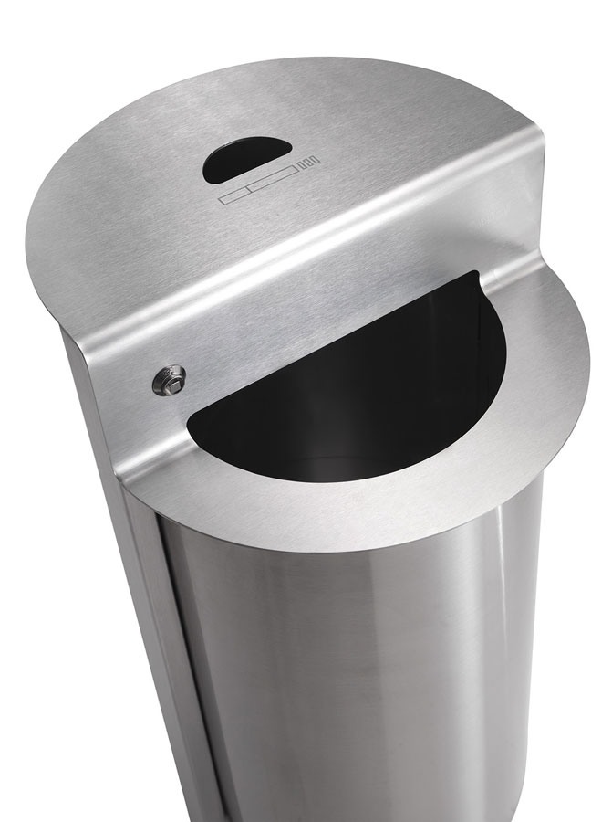 Ligne de cendriers-corbeilles à papier utilisables à l'extérieur, réalisés complètement en acier inoxydable AISI 304, avec support de sac et bac cendrier interne extractibles pour faciliter les opérations de nettoyage. Le couvercle est doté d'un système de blocage avec serrure. Fond foré pour faire couler l'eau de pluie. La base est prévue pour la fixation au sol.
