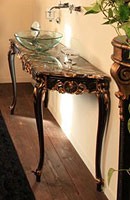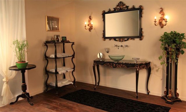 Salle de bains console avec structure en bois de hêtre et dessus de marbre. Finition en noir et la feuille d'or vieilli souligné. Adapté pour salles de bains de luxe classique.