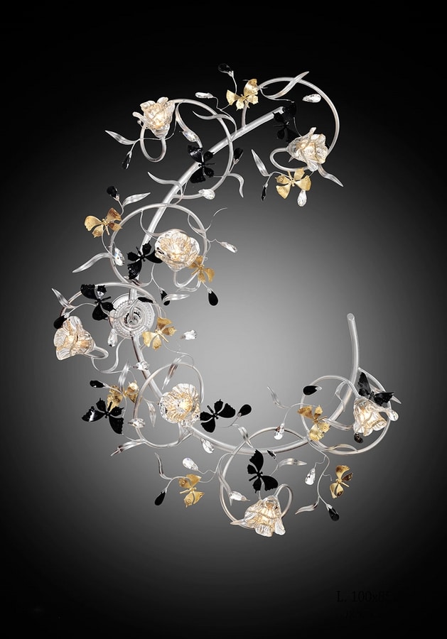 Deckenleuchte 7 Leuchten G9 max 40 Watt / Blattsilber, schwarze Tempera und antikes Blattgold / transparente Scholer-Kristalle / transparente Murano-Lichtdiffusoren Gold.