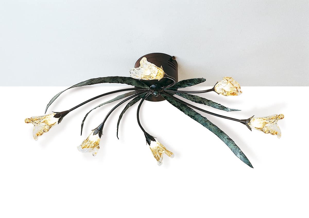 Plafonnier en fer à 6 lumières, finition marron avec des détails verts, peint à la main. Verre de Murano ambre.
