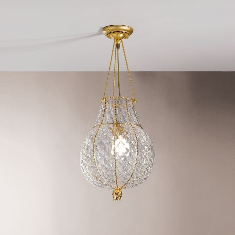 Plafonnier fait à la main en verre soufflé avec les techniques des anciens maîtres du verre de Murano. Finition en cristal Baloton avec des montants dorés.