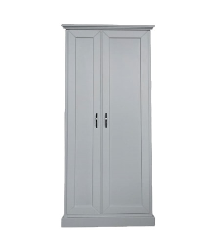 Porte-balai et porte-chaussures en bois massif. 2 compartiments dont le compartiment de gauche est libre et le compartiment de droite complet avec 6 étagères intérieures entièrement mobiles, inclinables et amovibles. Équipé de 2 portes de tailles différentes et fermeture amortie. Poignées choisies par le client.