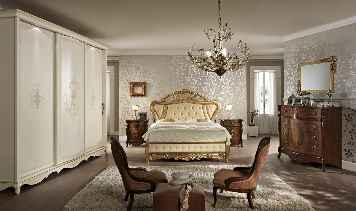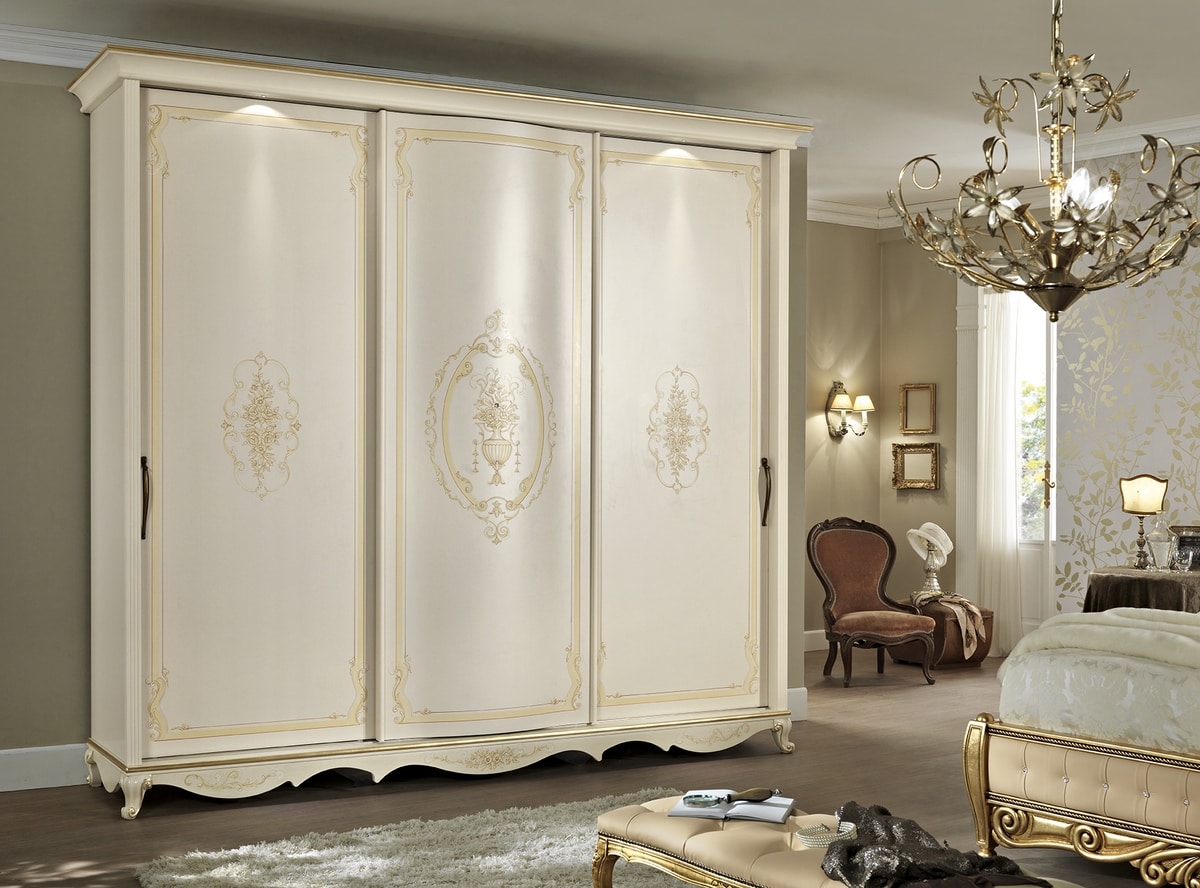 L'armoire Achilea, 3 portes coulissantes est patinée et décorée. Les portes sont travaillées exclusivement à la main dans les moindres détails ! Possibilité de l'enrichir de miroirs.