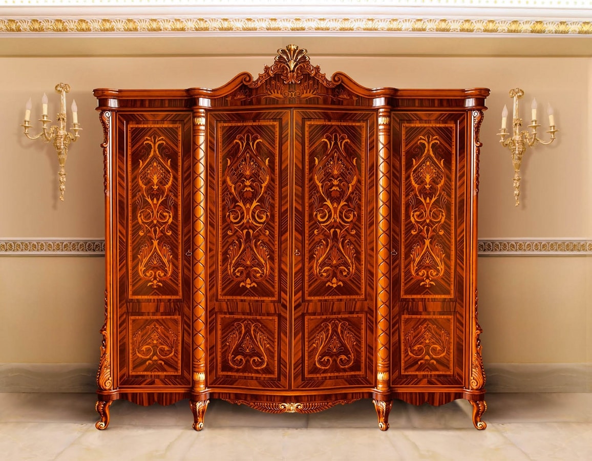 Armoire avec 4 portes incrustées et pieds et colonnes sculptés. Étagères et cintres en bois.