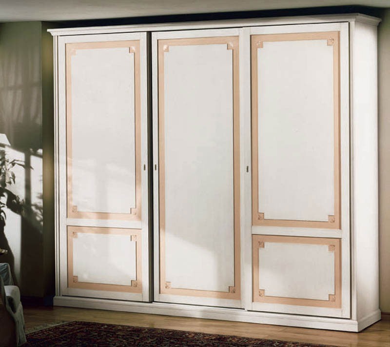 Armoire laquée avec 3 portes coulissantes. Garde-robe de luxe classique pour le mobilier chambre aménagée pour les hôtels et la maison. Fabriqué entièrement en nid d'abeille. Recouvert d'une finition laque spéciale à la feuille d'or ou d'argent. L'intérieur est fait de bois de noyer Tanganyika avec des étagères et des tiroirs.