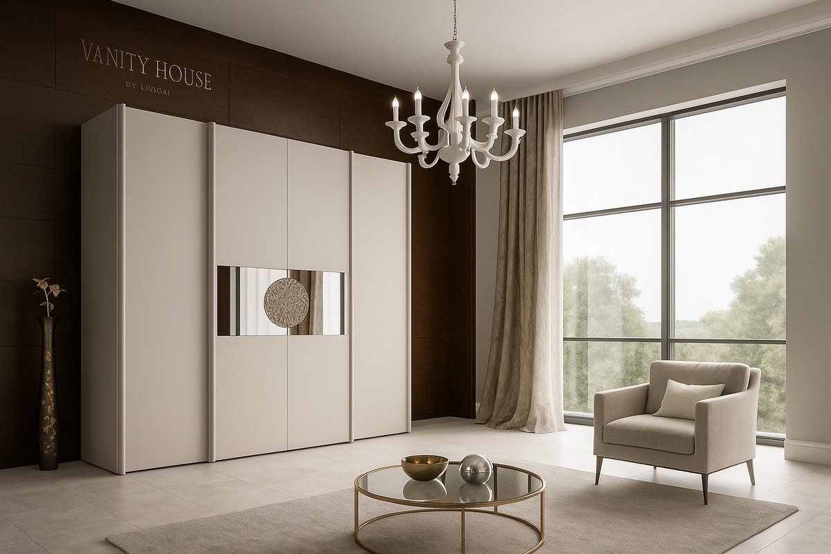 Armoire coulissante avec miroirs fumés et sculpture centrale