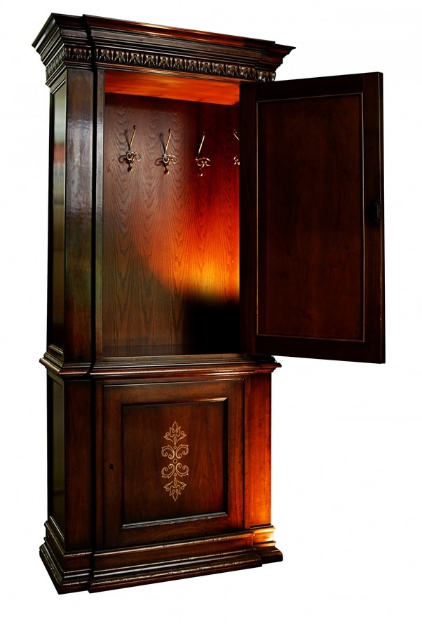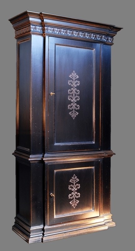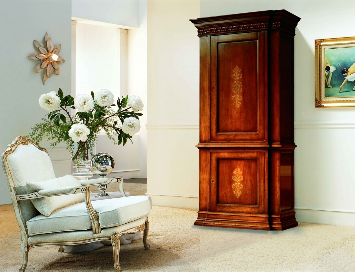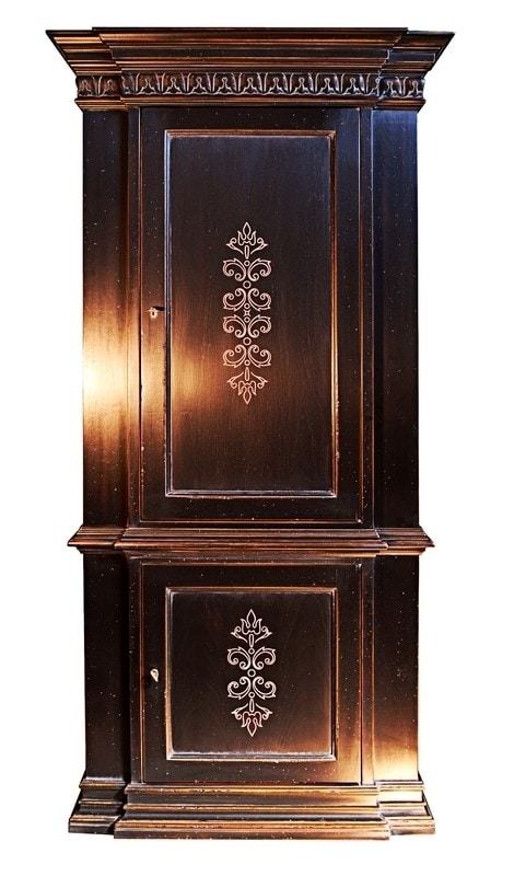 Buonluogo est une élégante armoire en noyer avec deux portes et compartiments secrets. Sur la corniche, un motif sculpté à la main longe le devant et les côtés de l'architrave, tandis que sur les panneaux de porte, l'incrustation caractéristique de style Certosina avec son design détaillé et élégant contraste de manière frappante avec la solidité du bois. Le compartiment inférieur est équipé de deux étagères internes. Sur la photo, bois de noyer noirci et teinté avec patine (code : CE01), usure normale.