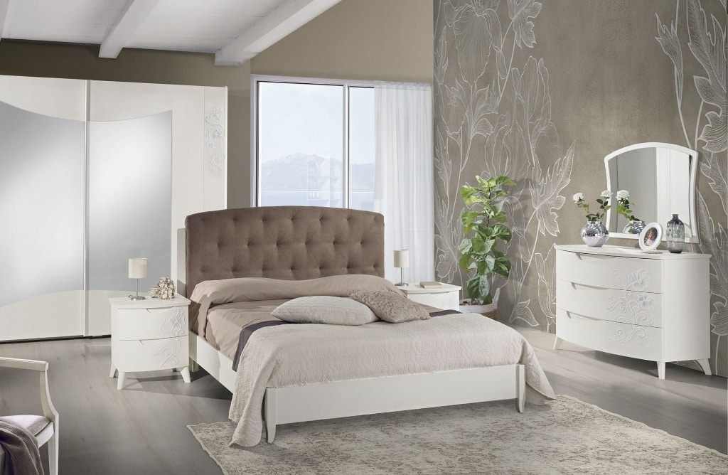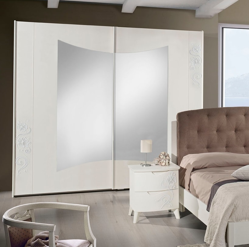 Armoire Emily 2 portes coulissantes, frêne blanc, décorée à la main, avec miroirs. Portes à fermeture douce.
