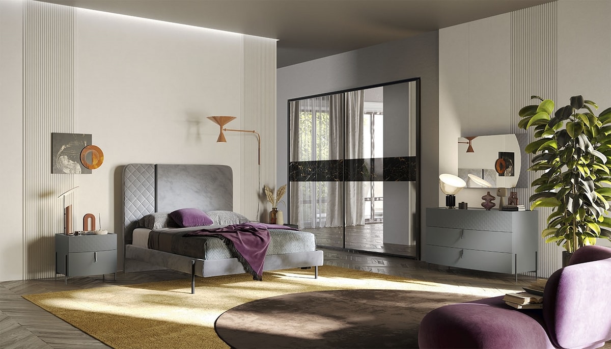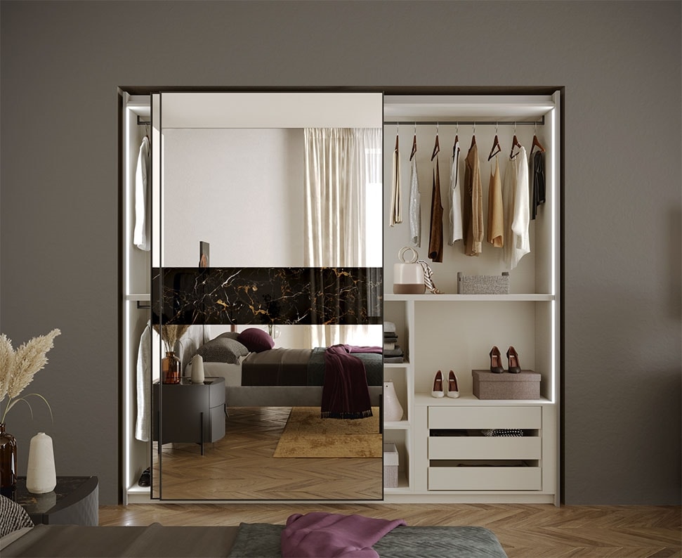 Armoire à deux portes coulissantes, avec façade en miroir et inserts en marbre Portoro.