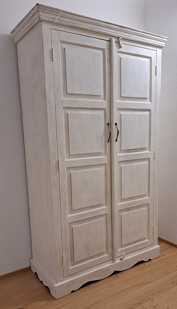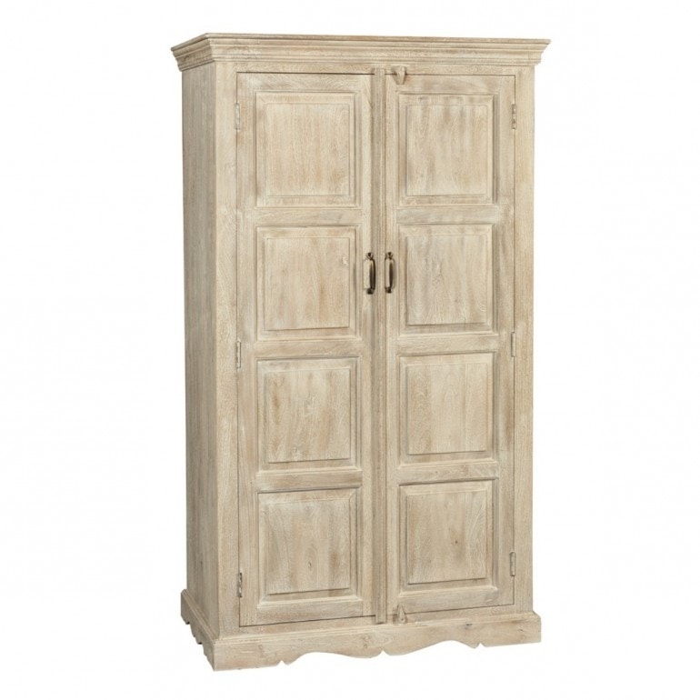 Armoire en bois massif de la mangue, adaptée au salon et également pour d'autres espaces de la maison. La garde-robe est composée de deux portes à poignée, à l'intérieur, il y a un bâton de transporteur et deux étagères. Décapez la couleur blanche.