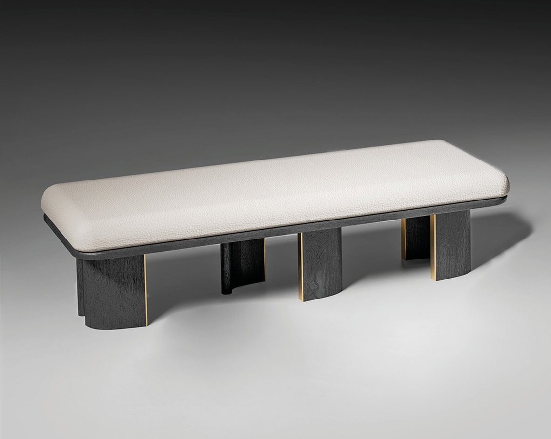 L'assise est tapissée et recouverte de tissus ou de cuirs naturels, pour un confort discret et raffiné qui dialogue avec la structure en bois. Le contraste entre la douceur du revêtement et la solidité du pied courbé crée un équilibre visuel et tactile qui invite à l'usage et à la contemplation. Disponible en plusieurs longueurs et finitions, le banc « Torii » interprète le thème de la modularité avec grâce et fonctionnalité, mêlant savoir-faire et design contemporain en un seul geste cohérent.