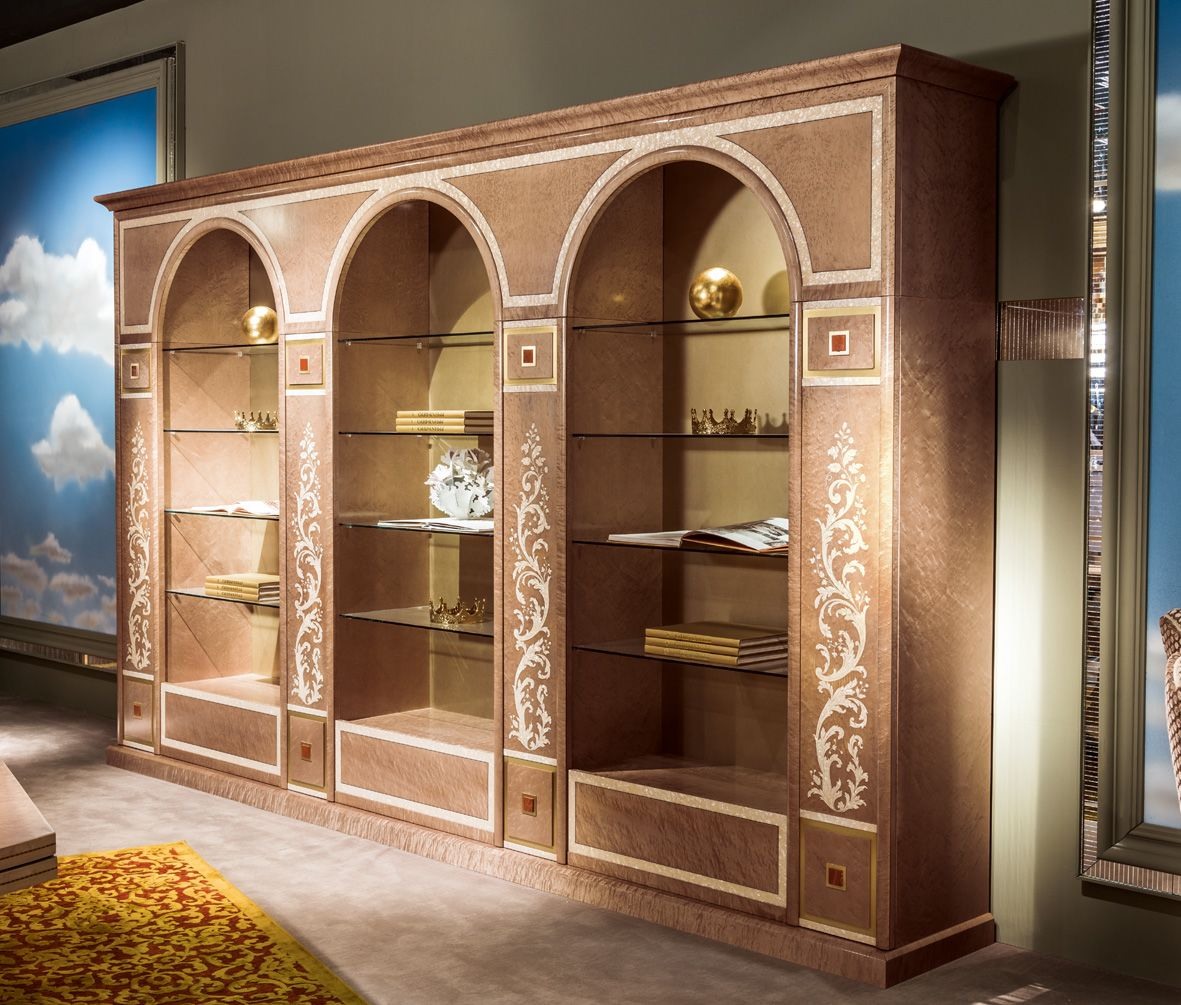 Classique bibliothèque Trois Arches. Les étagères en verre. ( 376 cm x 52 x 225 h )
