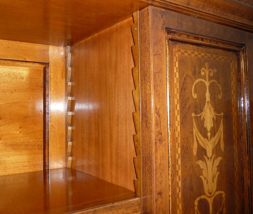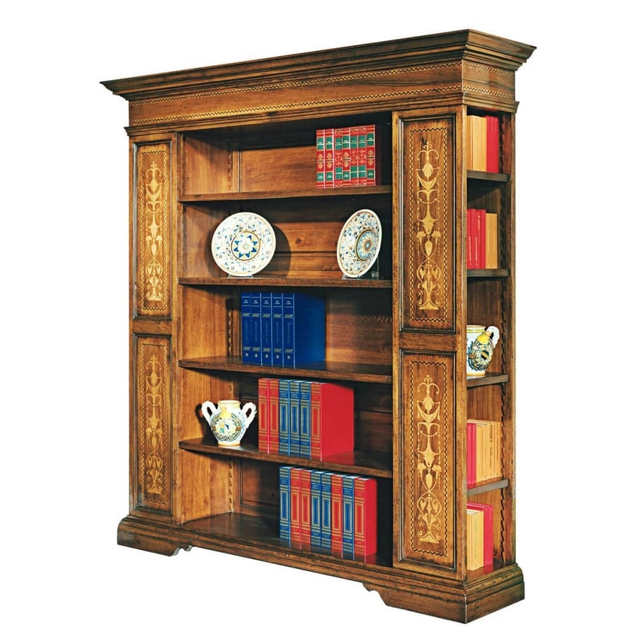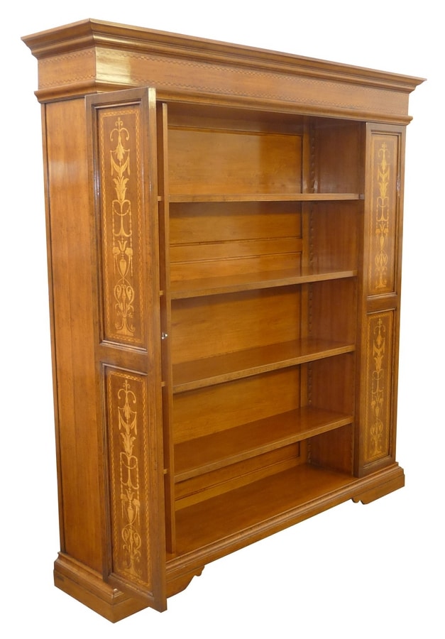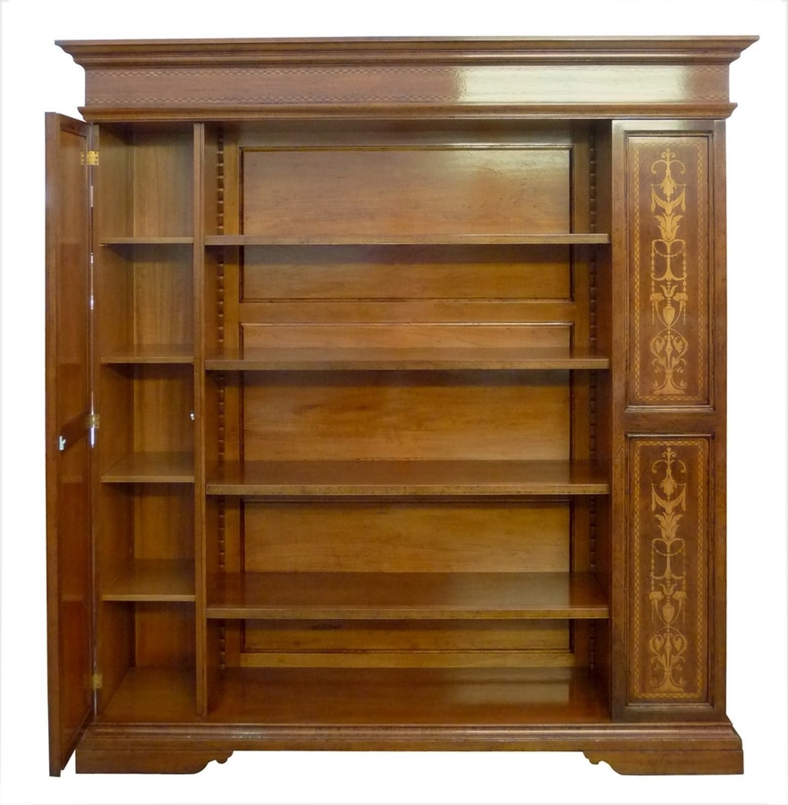 Bibliothèque ouverte en noyer de style Renaissance, inspirée du mobilier italien de la fin du XVIe siècle. Architrave moulurée avec marqueterie horizontale en érable et palissandre. Bandes latérales de pilastre avec incrustation verticale de candélabres en bois d'érable avec motif végétal. Pieds en blocs moulés à la base caractéristiques du style d'ameublement de l'époque. Aménagement intérieur en frêne massif formé de quatre étagères avant repositionnables grâce aux encoches en bois du fond, et de quatre étagères dans chacun des évidements latéraux.