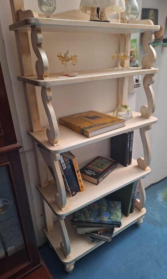 Bibliothèque en bois, finition laquée blanche patinée, avec profils de feuilles en argent.