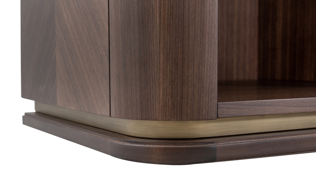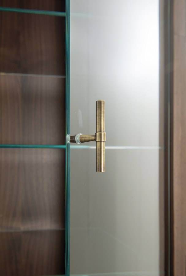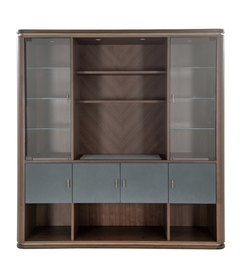 Une bibliothèque élégante à Canaletto Walnut, conçue pour combiner la fonctionnalité avec le raffinement. Les portes en verre extra-claires sur les côtés révèlent les étagères intérieures, tandis que la section centrale en noyer comprend des étagères en bois et un dessus avec un insert en cuir - idéal pour l'affichage ou le rangement. Les quatre portes inférieures, rembourrées en cuir et ornées de poignées métalliques bronzées, ajoutent une touche d'élégance discrète. Une finition mate améliore le grain naturel du bois, achevé avec des détails en bronze.