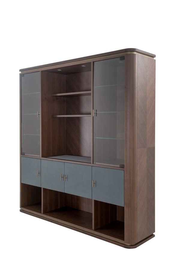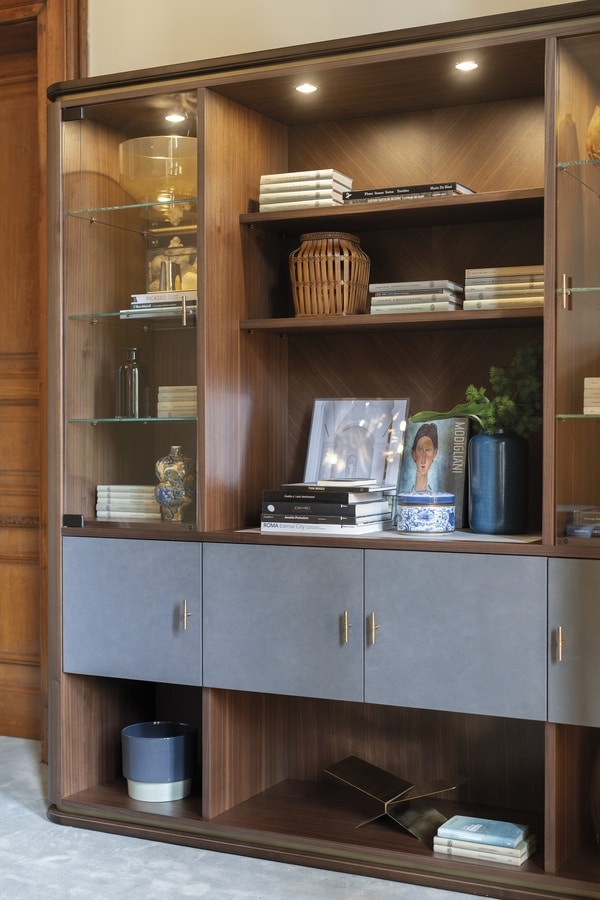 Bibliothèque élégante à Canaletto Walnut, avec des inserts en cuir