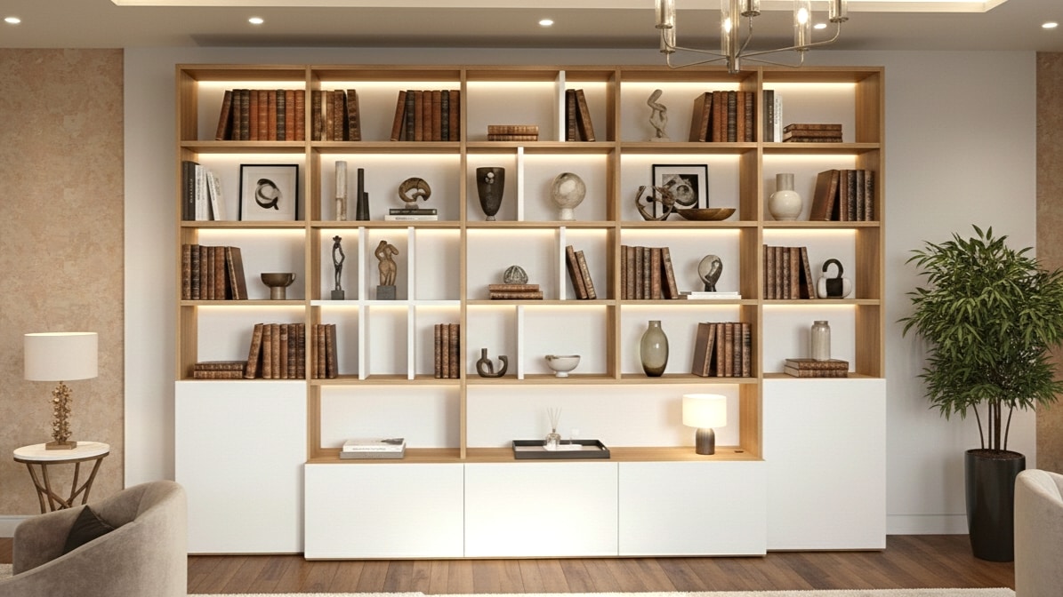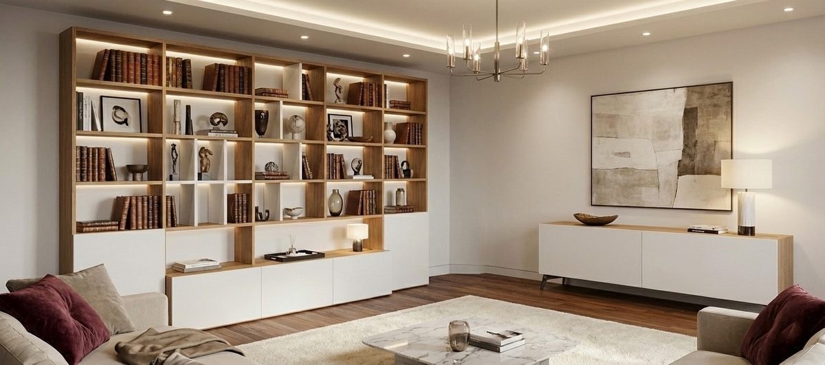 Système de bibliothèques sur mesure en bois latté, conçues et fabriquées selon la conception ou le projet du client, idéales pour les niches, les grands murs ou les espaces architecturaux complexes.