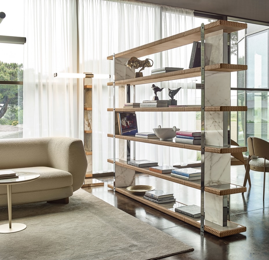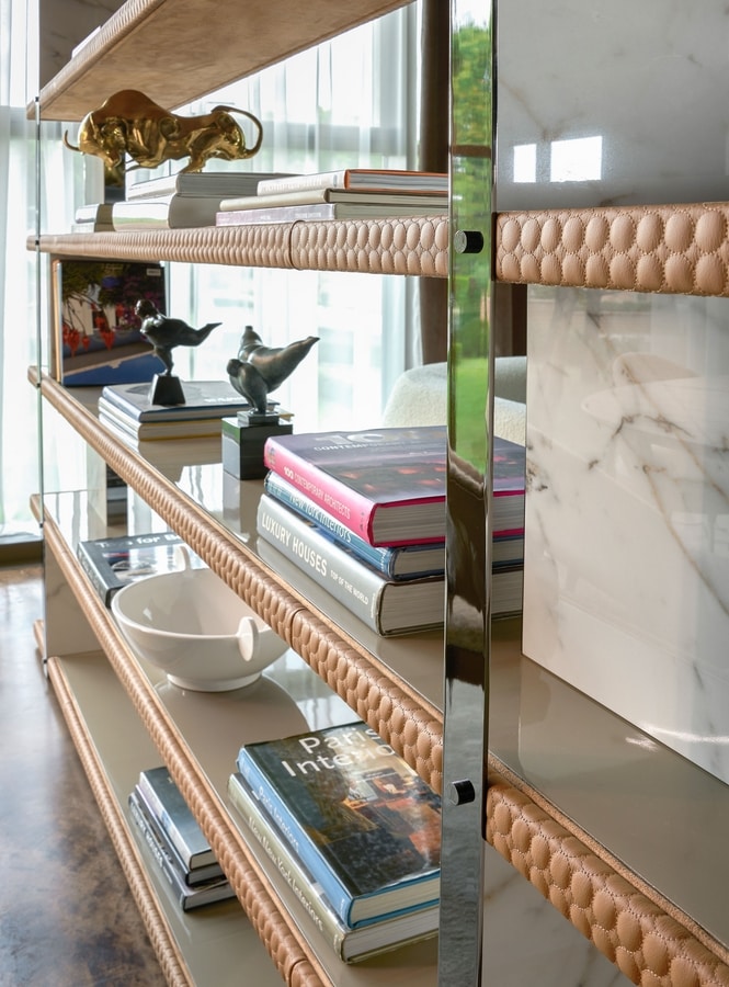 Bibliothèque avec étagères en contreplaqué laqué et rembourré. Ils sont fixés au moyen de supports verticaux en métal et en grès.