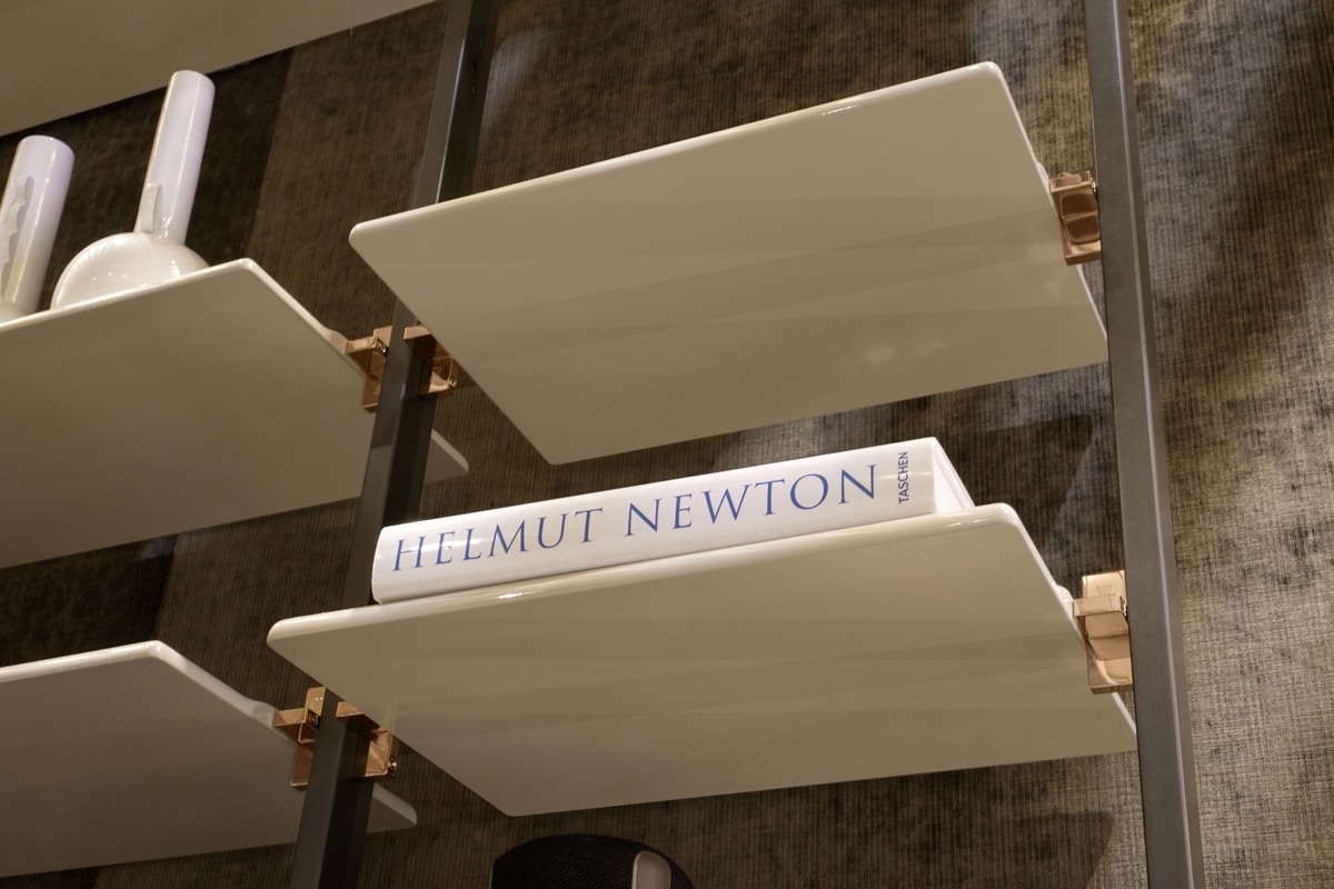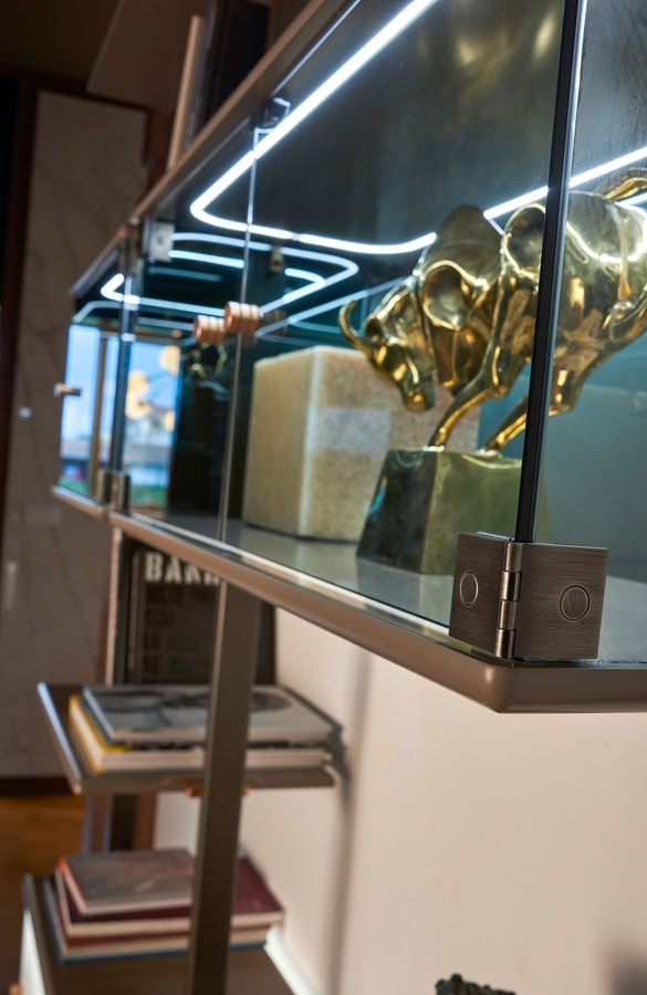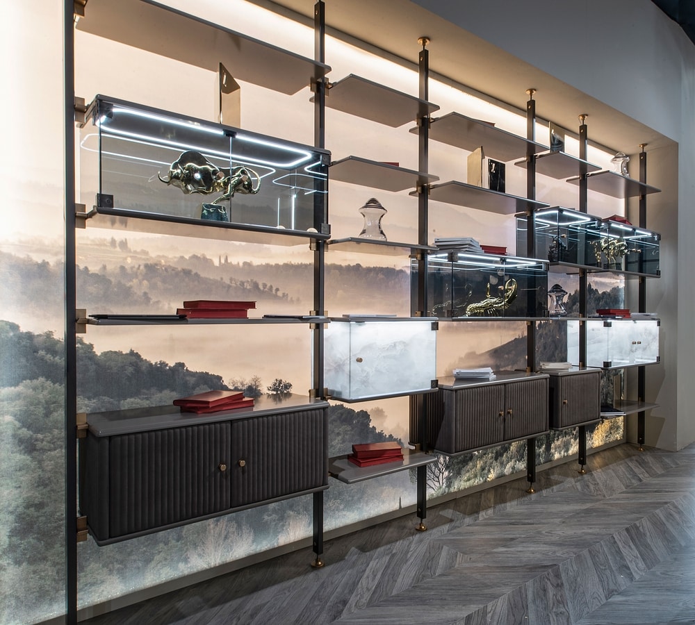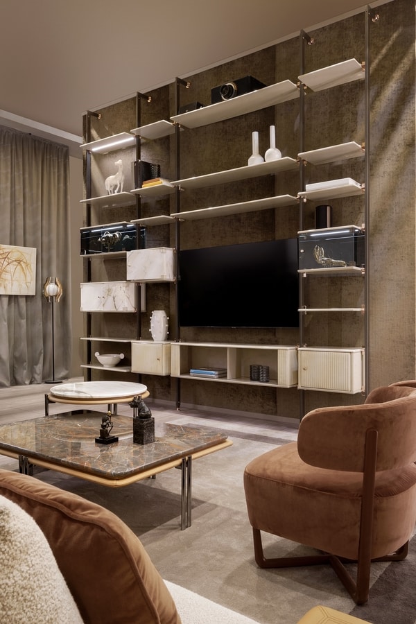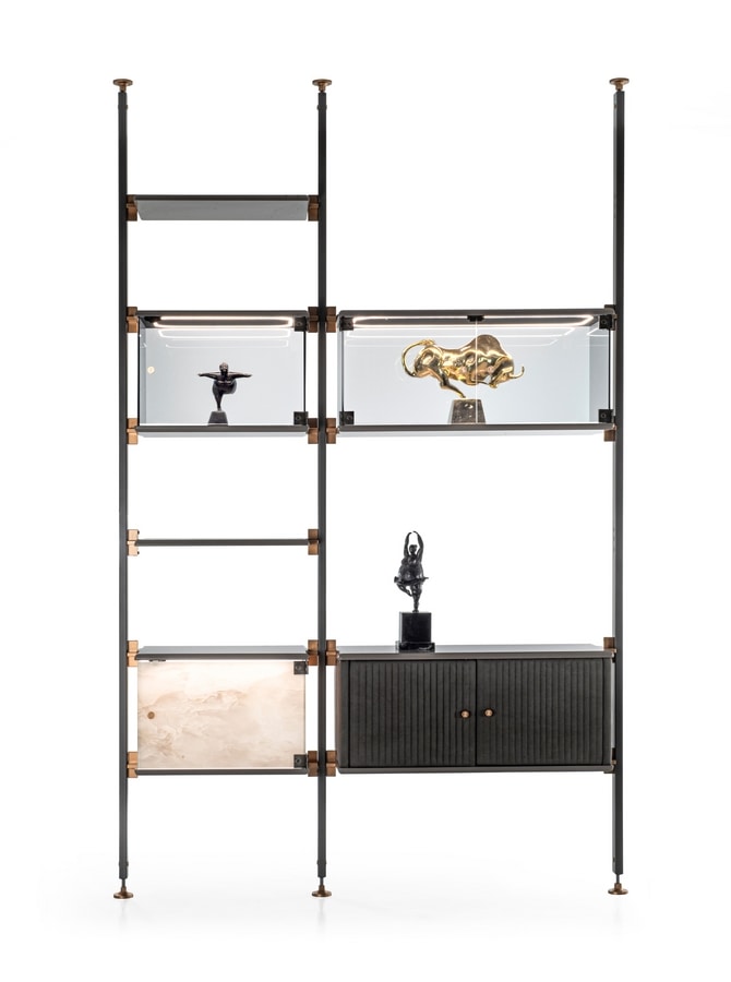 Bibliothèque modulable avec étagères et conteneurs laqués disponibles en verre fumé, vitrail onyx, grès ou recouverts de tissu ou de cuir. Montants réglables en hauteur avec fixation au plafond ou au mur. Étagères et porte-conteneurs en laiton.