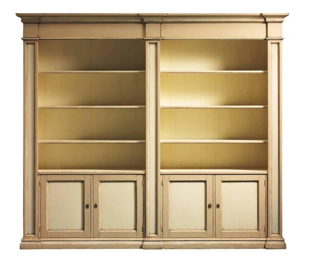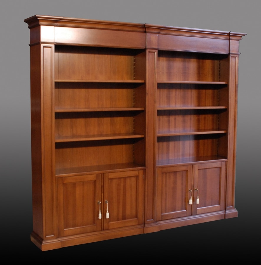 Bibliothèque ouverte d'inspiration 1800 composée de deux compartiments à trois étagères fixes chacun, un dos lisse et trois piliers décorés. En bas, quatre portes encadrées avec clé et étagères intérieures. Plinthe linéaire avec une moulure simple qui est rappelée sur la corniche.