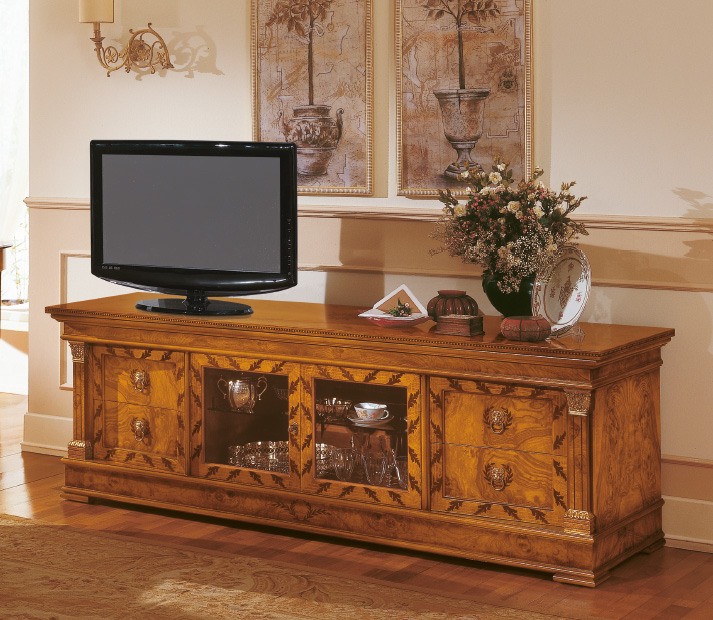 Classique porte-tv / buffet de luxe. Buffet avec des décorations artisanales faites par des artisans italiens. Buffet à deux portes et quatre tiroirs.