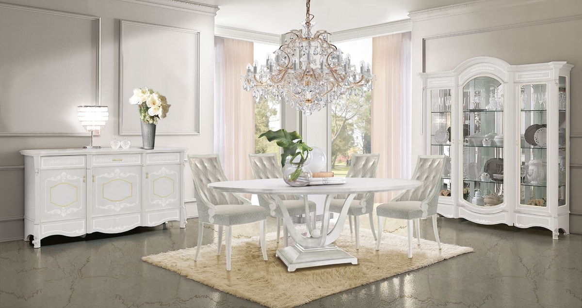 Buffet en bois laqué blanc, avec trois portes. Un séjour glamour, avec un style élégant et raffiné, est le meilleur choix pour ceux qui veulent une touche chic dans leur propre maison. Des sculptures design qui se révèlent dans le raffinement des détails, dans le choix des matériaux naturels, dans la valeur d'un goût italien, des formes émotionnelles nées d'un parfait équilibre entre l'homme et la nature dans le langage du glamour.