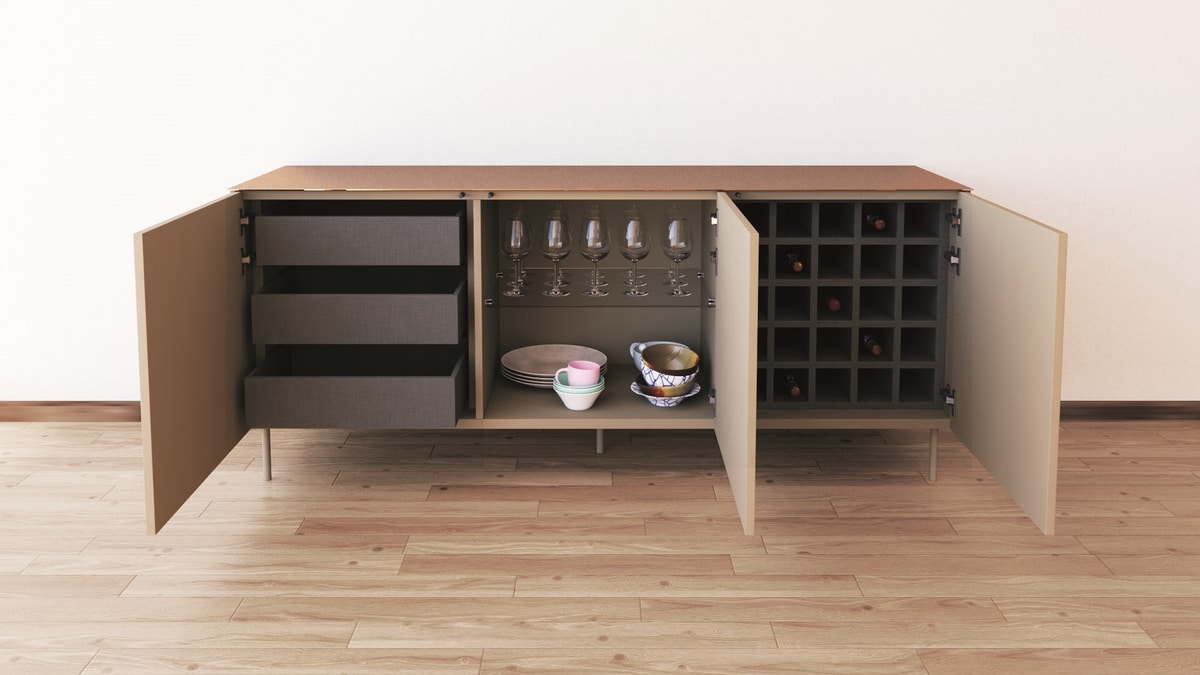 Le buffet ADE est un mélange impeccable de verre élégant et la chaleur naturelle du vrai bois en face. Les portes présentent une interaction accrocheuse de panneaux en masse et de miroirs bronzés et martelés, créant un design à la fois discret et distinctif.
