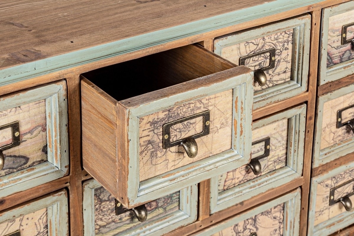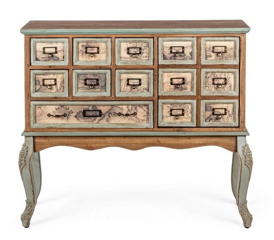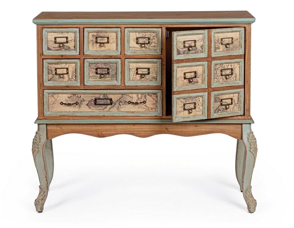 Buffet avec structure en bois de pin. Fond de tiroir en contreplaqué. Finition à base de nitrocellulose. Poignées en acier. pieds à assembler.