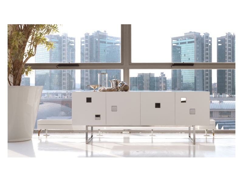 Buffet laqué mat ou brillante avec portes à battent et poignées chromées. Socle en acier cromé ou laqué blanc. Livré monté. Le pied peut etre vissé alors de la livraison chez le client final.