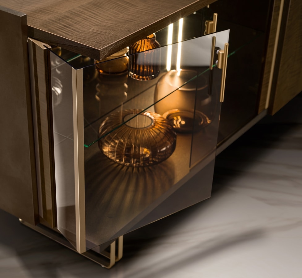 Les panneaux latéraux en bronze mat et les profils en or satiné de couleur champagne introduisent un contraste raffiné, soulignant les volumes et ajoutant une touche précieuse qui élève la sophistication globale de la collection.