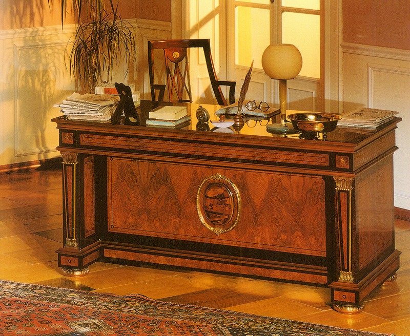 Classique bureau de luxe à domicile dans Brierwood pour recouvrement "IMPERO", avec des sculptures faites à la main solide et exclusif incrustations en bois. Disponibles avec ou sans les détails de feuilles d'or. Le bureau est disponible avec des dimensions standard de cm. 160 x 200 x 80 ou 90 ou avec les tailles personnalisées. Chaque bureau Marzorati est un mélange de design, de classicisme et de fonctionnalité qui combine la beauté du mobilier classique à la fonctionnalité nécessaire aujourd'hui.