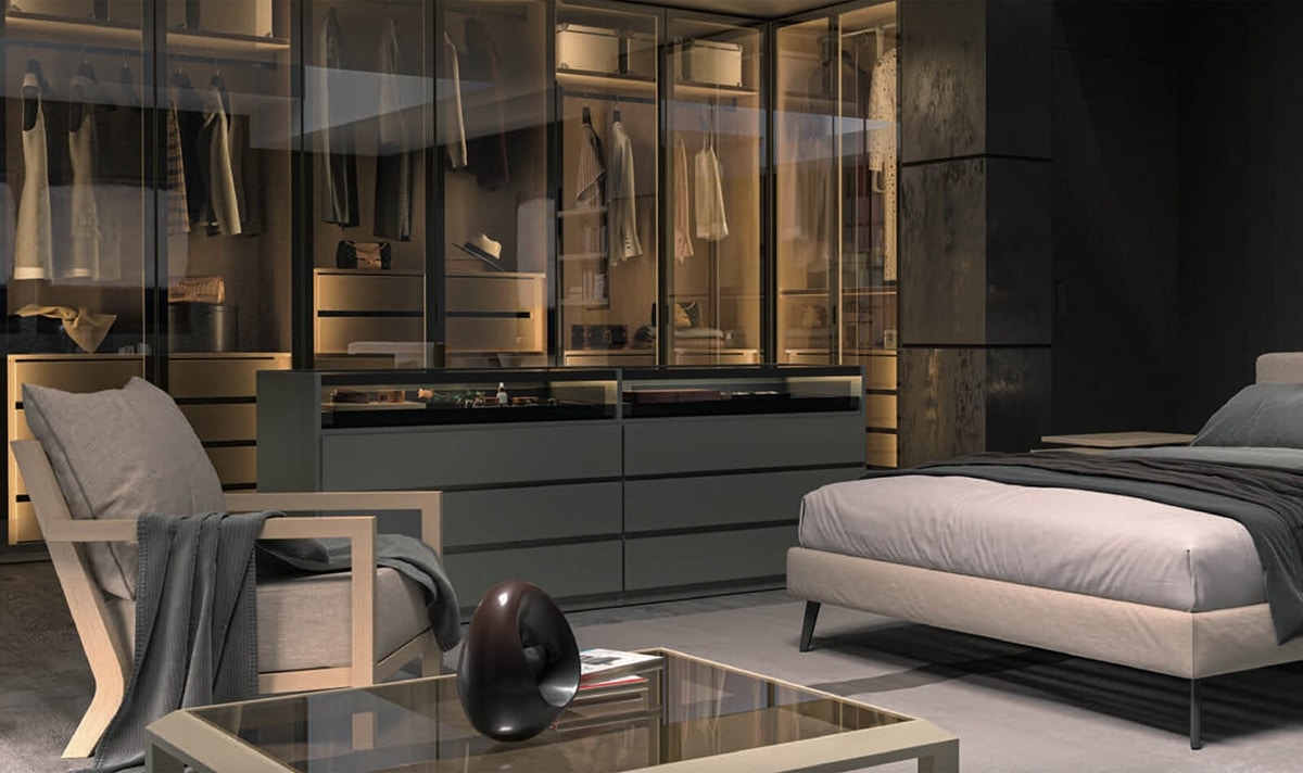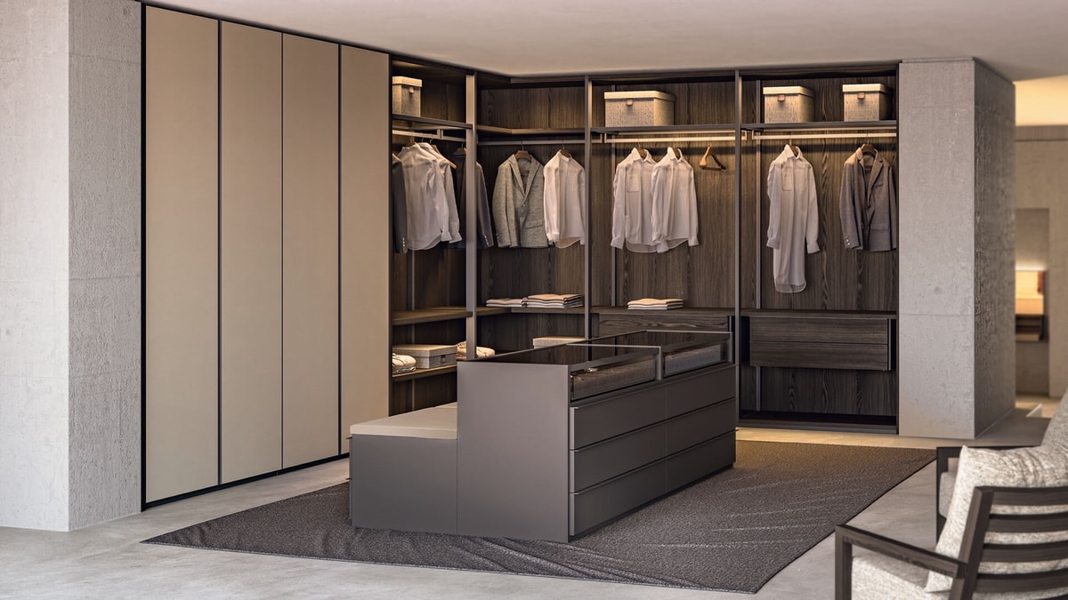 Le système de garde-robe Elli évolue continuellement avec de nouvelles solutions esthétiques et fonctionnelles, offrant une flexibilité de conception maximale. Sa structure modulaire permet des configurations personnalisées, s'adaptant parfaitement à n'importe quel espace architectural. Les panneaux latéraux du cadre, y compris les options de verre, les panneaux arrière, les bases et les étagères, se combinent avec différents types de portes, battantes ou coulissantes, tandis que les finitions vont des placages de bois aux surfaces texturées et aux matériaux raffinés comme le verre, transformant les armoires en vitrines élégantes. Tiroirs, aménagements intérieurs et accessoires complètent une offre sophistiquée qui harmonise fonctionnalité et design dans chaque espace.