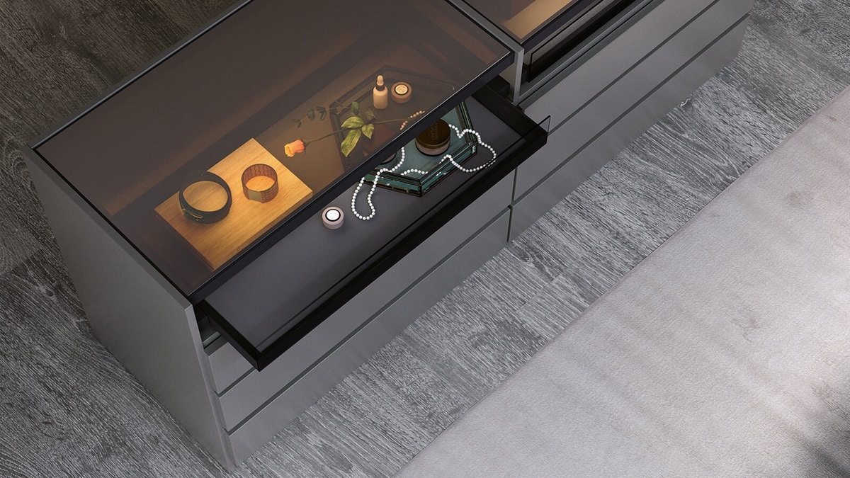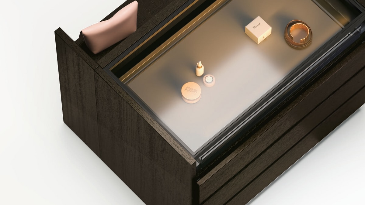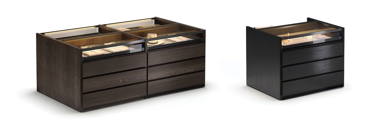 Demander prix Produits similairesCommode îlot pour système dressing modulable, structure en nid d'abeille disponible en finition laquée ou bois. Les étagères en aluminium et verre intègrent le système d'éclairage LED, chaque côté est équipé d'un rail électrifié qui alimente les LED des étagères.