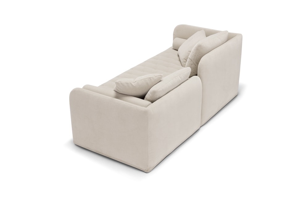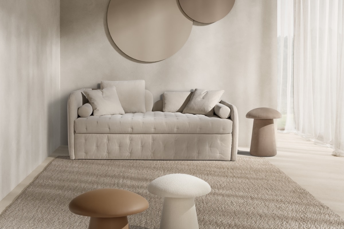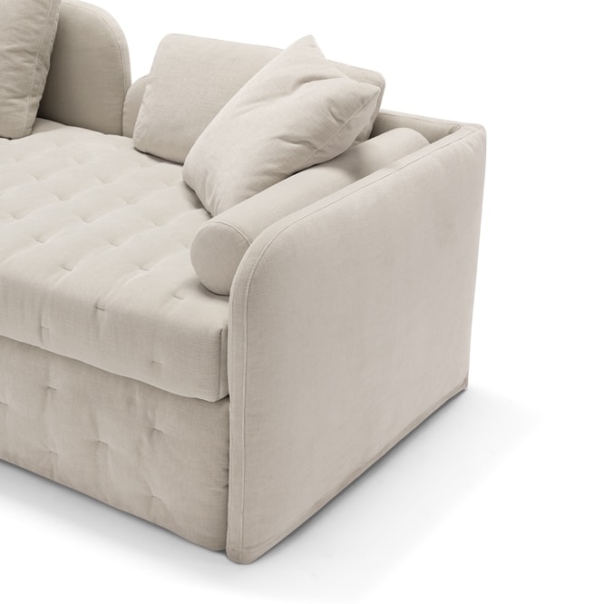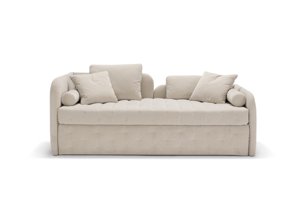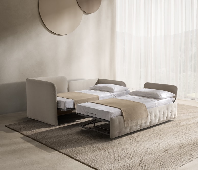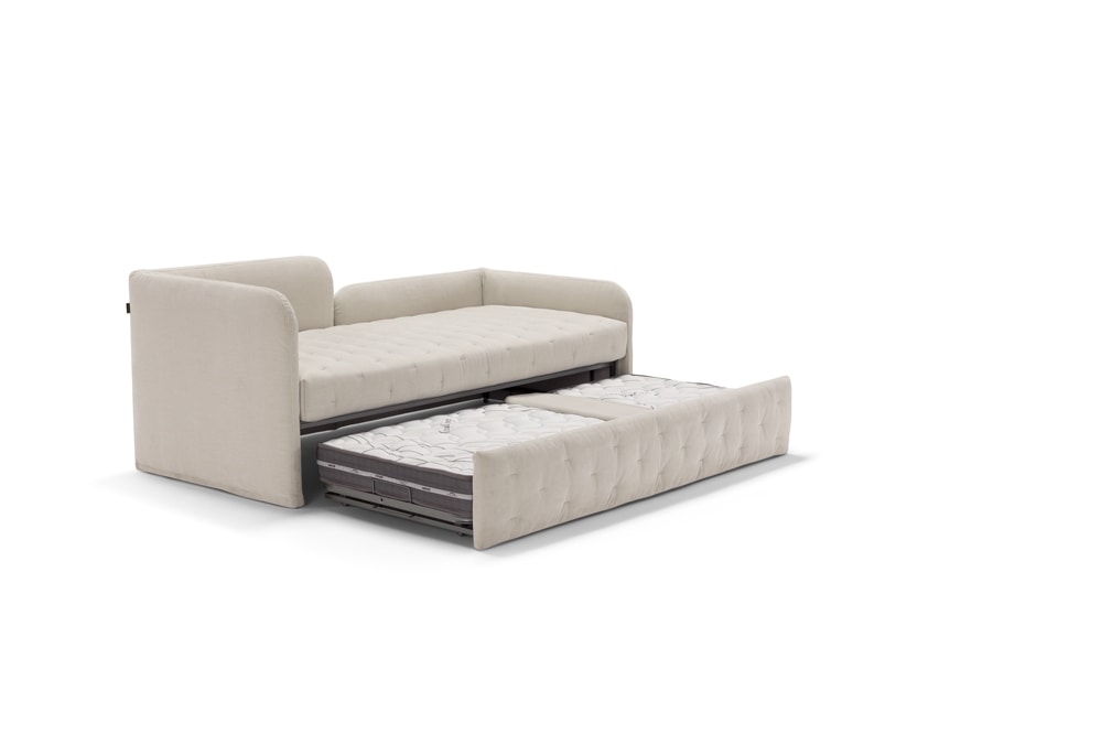 Demander prix Produits similairesDécouvrez Naomy, le canapé-lit qui allie romantisme et fonctionnalité avec élégance. Ce modèle se distingue par son deuxième sommier extractible, assurant esthétique et praticité. Naomy est conçu avec des accoudoirs et dossiers disponibles en deux hauteurs, librement combinables pour s’adapter à vos préférences esthétiques et ergonomiques. Des coussins moelleux en duvet d’oie, complétés par deux élégants coussins cylindriques, enrichissent l’assise. Le revêtement matelassé, finement travaillé, témoigne du savoir-faire artisanal, ajoutant une touche raffinée à l’ensemble. Le modèle Naomy ne se contente pas d’être agréable à l’œil et d’offrir un confort parfait à tout moment de la journée, il exprime également tout son potentiel lors du passage à la configuration de deux lits simples. L’assise se convertit en première surface de couchage, tandis qu’un deuxième lit se déploie en glissant un sommier depuis la base. Un simple levier permet ensuite d’aligner les deux lits à la même hauteur.
