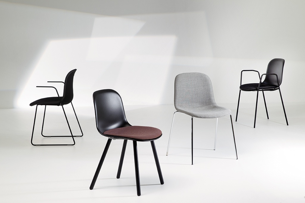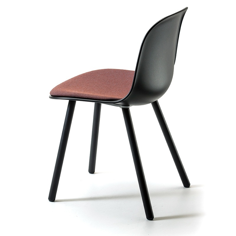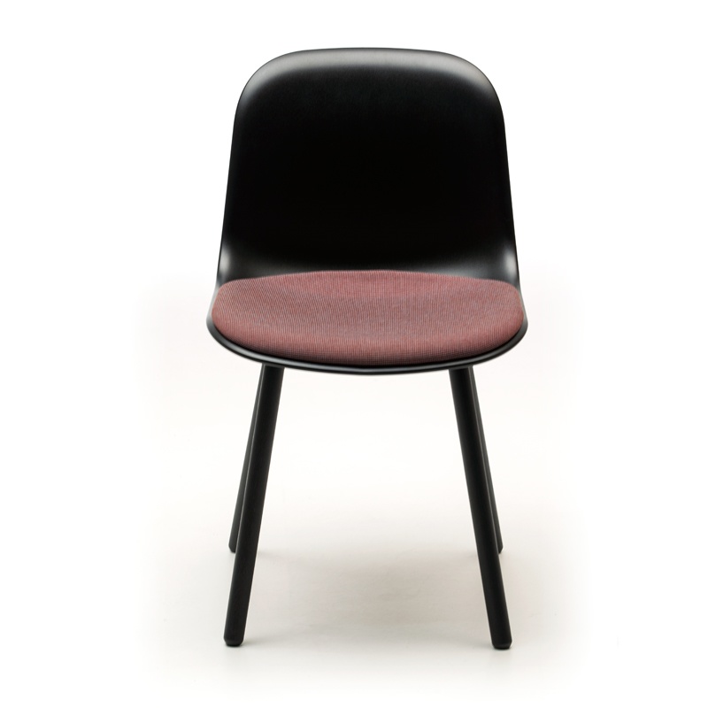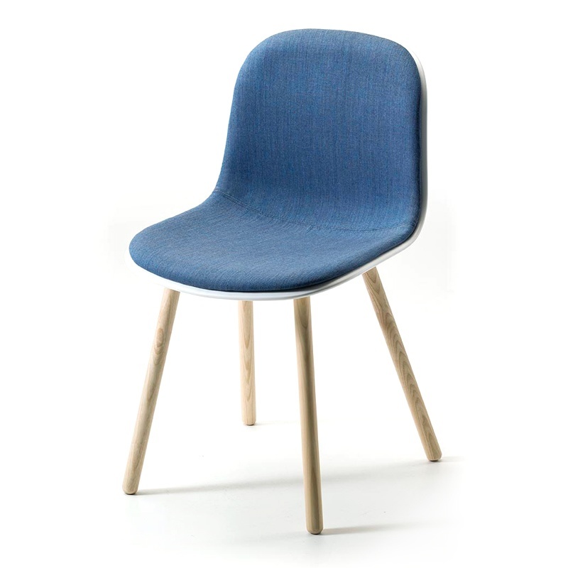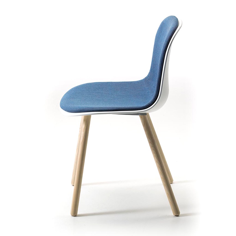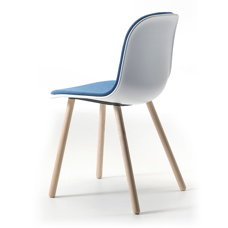 Chaise avec cadre en bois de frêne massif avec 4 pieds. Coque en polypropylène, disponible dans une large gamme de couleurs, peut être rembourré ou fourni avec coussin fixe ou avec contre-coquille sandwich-tapissé.