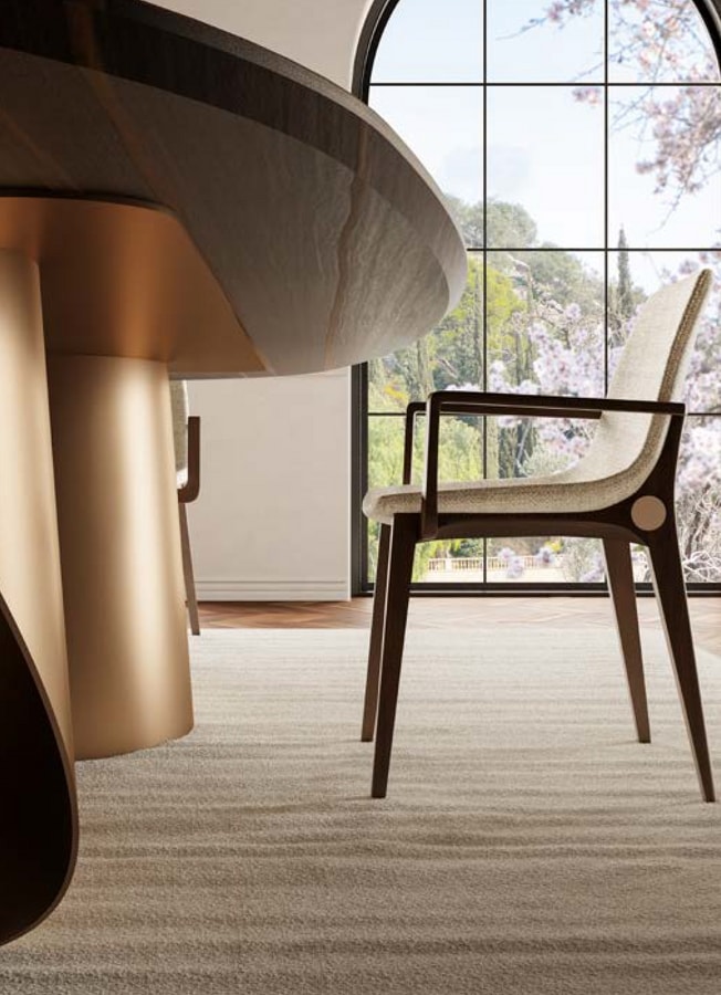Les accoudoirs suivent un profil géométrique et élancé, se connectant en douceur aux pieds arrière. L'assise et le dossier sont constitués d'une monocoque rembourrée aux lignes douces, conçue pour s'adapter de manière ergonomique au corps.
