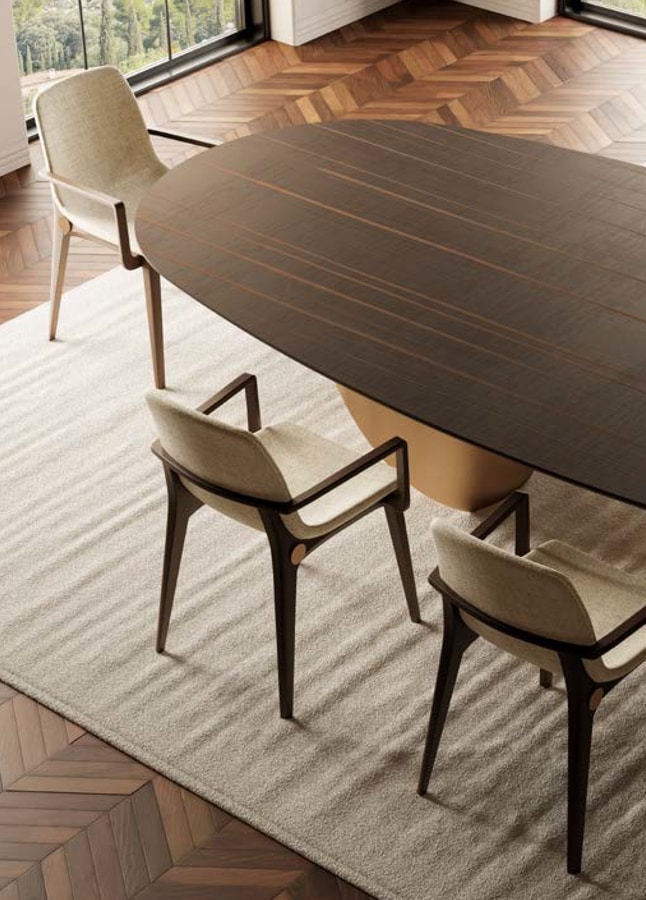 La chaise est réalisée avec une structure raffinée en bois massif dans des tons chauds et sombres qui mettent en valeur le grain naturel du matériau.