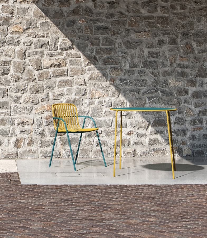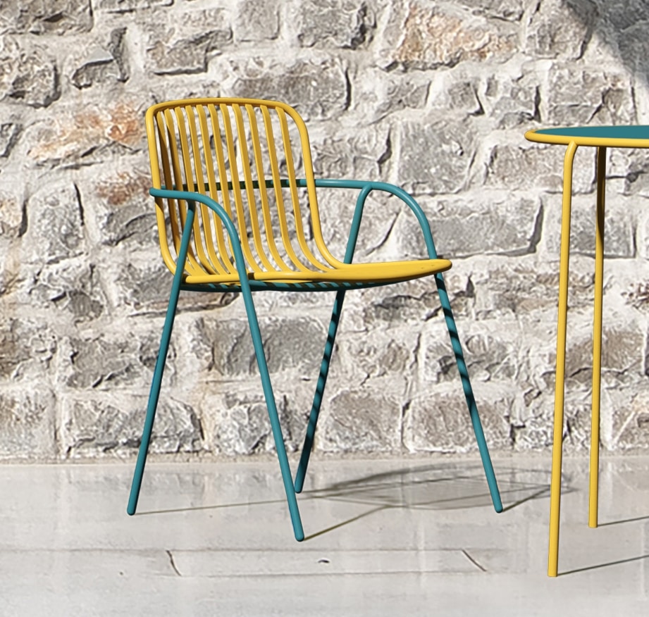 Chaise empilable avec accoudoirs, en acier pour une utilisation en plein air, disponible dans différentes couleurs et également en version bipolaire.