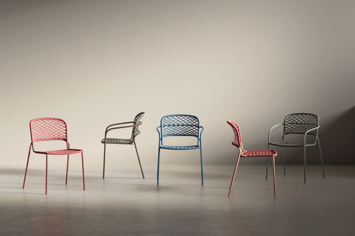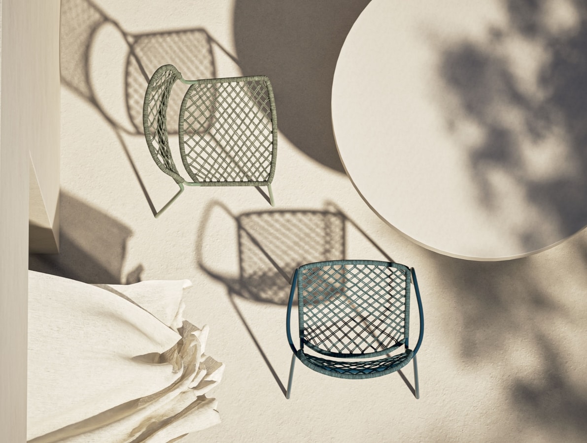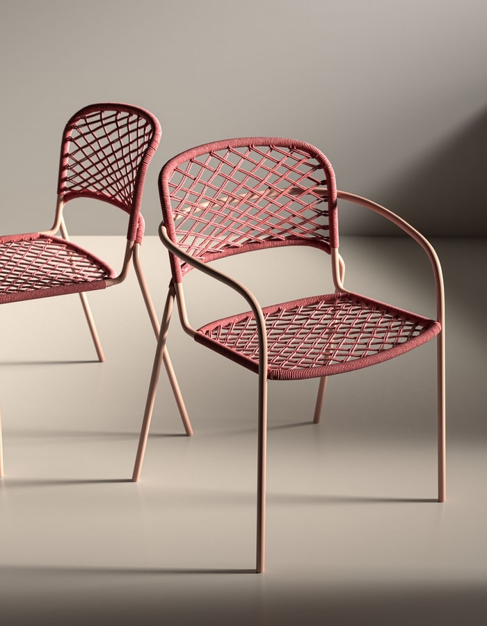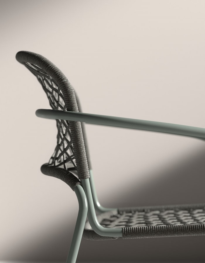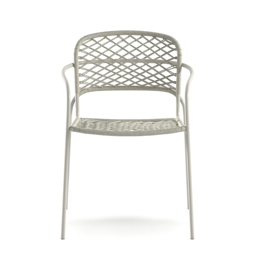 Chaise empilable avec accoudoirs, structure en acier peint, assise et dossier tissés en corde nautique à haute performance.