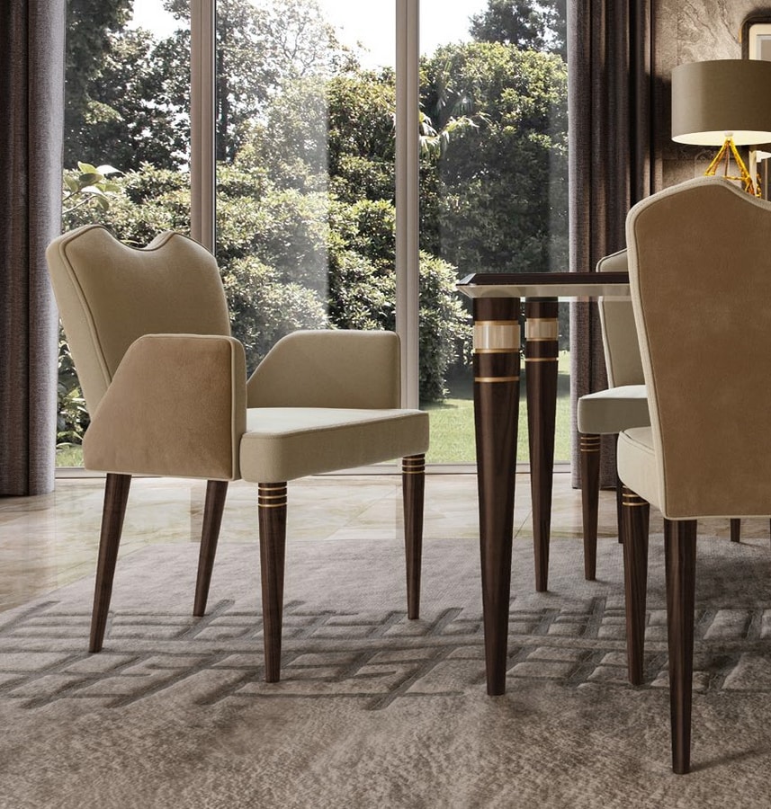 Chaise de salle à manger rembourrée avec accoudoirs. Pieds en bois.