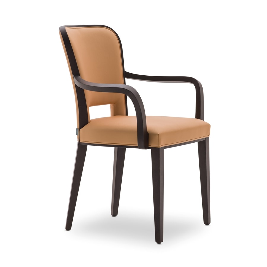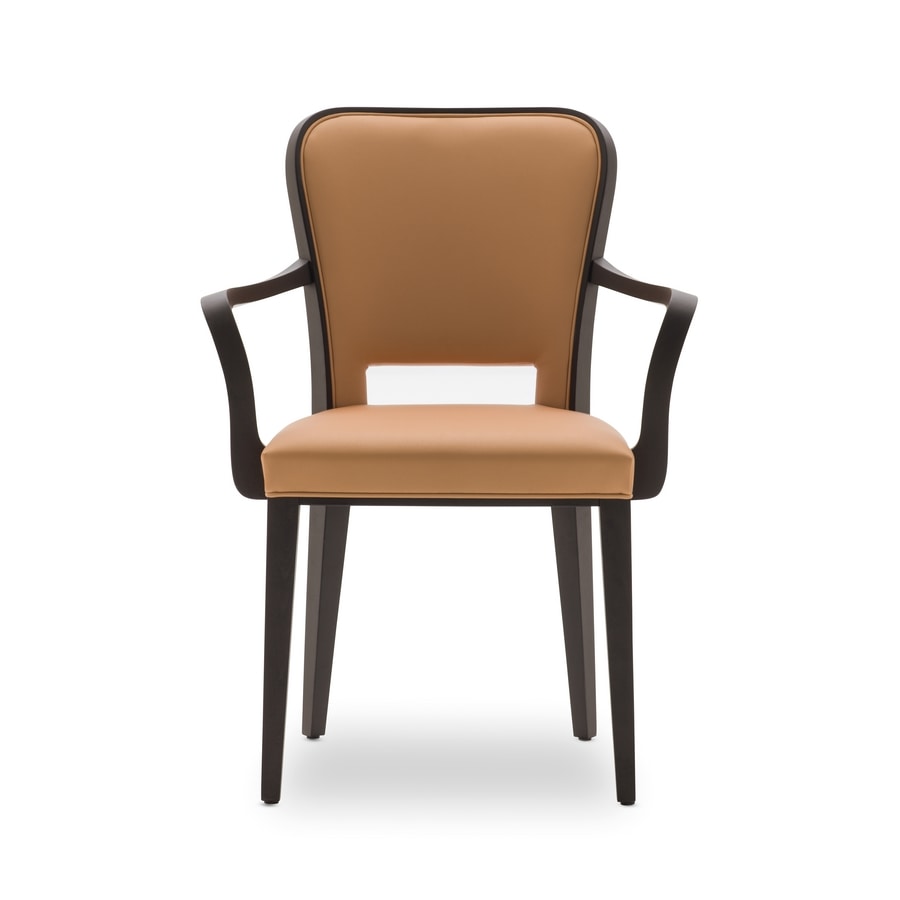 Chaise avec accoudoirs, structure en bois massif. Assise et dossier rembourrés avec détails du passepoil sur l’assise, dos avant et arriere. Dossier avec ouverture. Cadre du bois massif visible sur le dos.