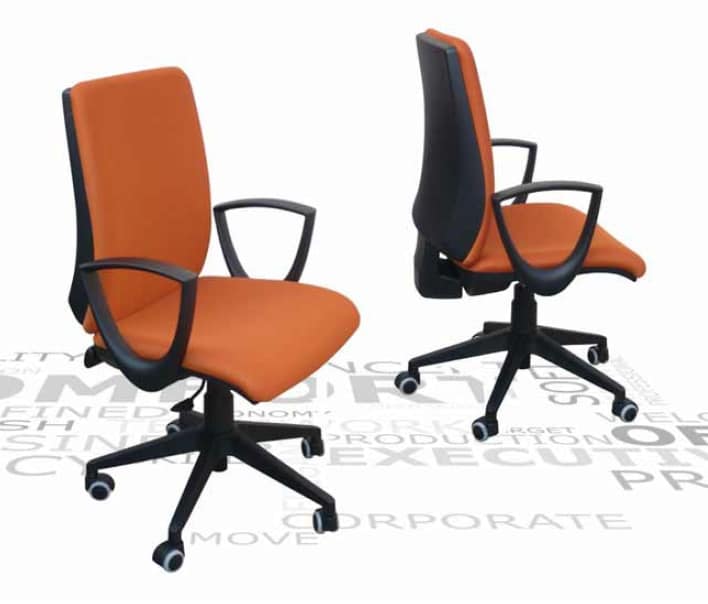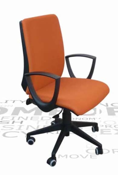 Chaise de bureau avec accoudoirs. Assise et dossier rembourrés avec tissu personnalisable. Réglable en hauteur. Sur les roulettes.