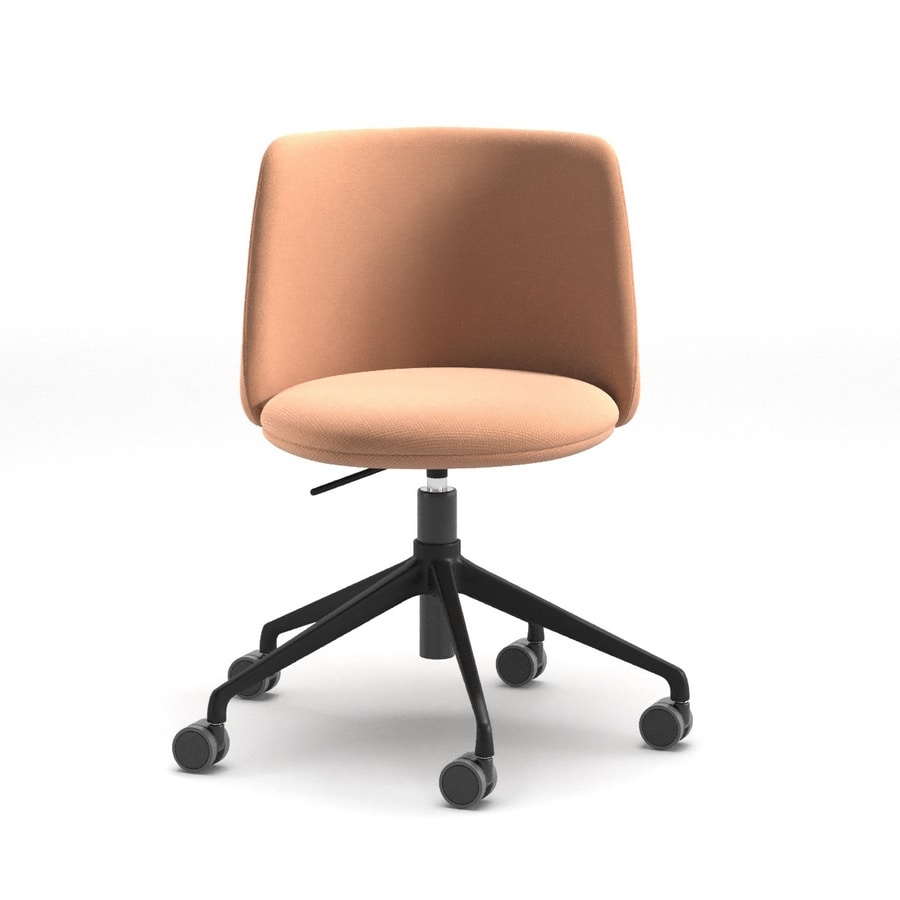 Chaise pivotante de bureau à domicile avec base réglable en hauteur, piétement à 5 branches en aluminium poli ou peint avec roulettes, assise et dossier en contreplaqué de hêtre avec mousse de polyuréthane ignifuge, revêtus de tissu.