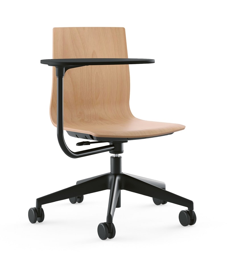 Version campus: disponible uniquement sur roulettes et équipée d'une grande tablette écritoire en HPL noir de 10 mm d'épaisseur, orientable sur elle-même et également à 360° sur l'axe du fauteuil, permettant de la positionner à gauche ou à droite, au choix. Finition du piètement aluminium Ø 68 cm: poli. Finition du piètement Ø 68 cm Nylon: noir.