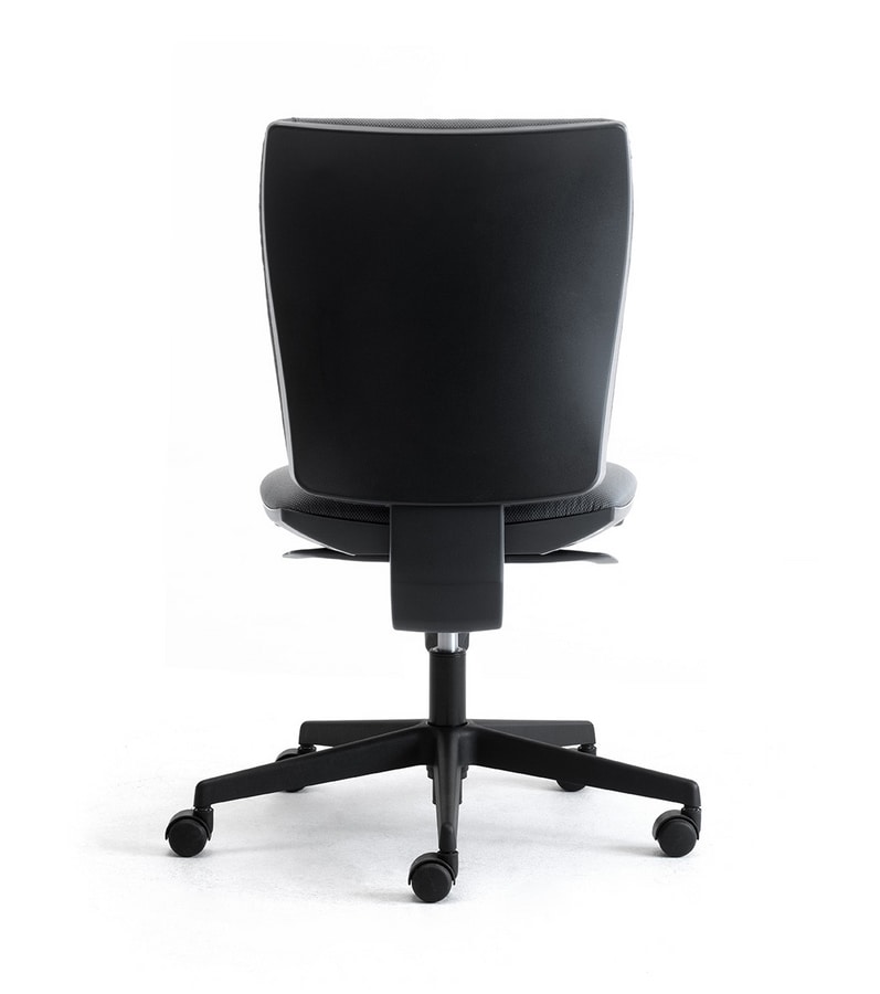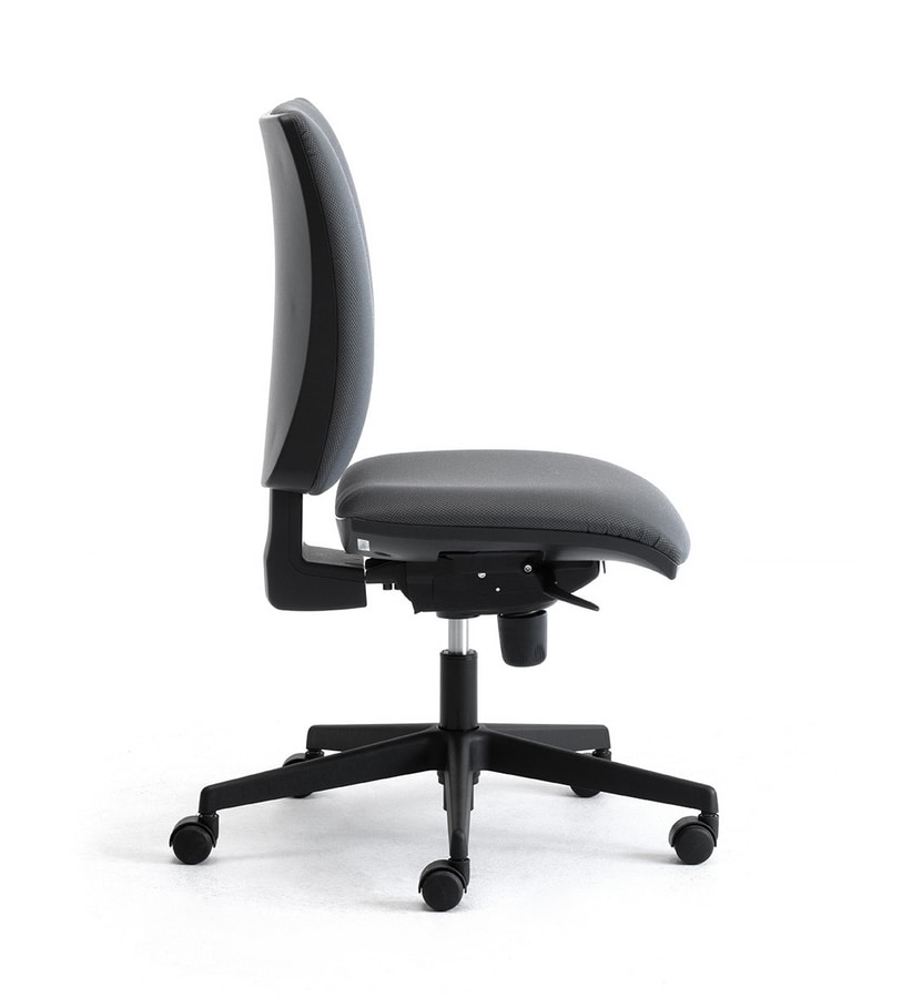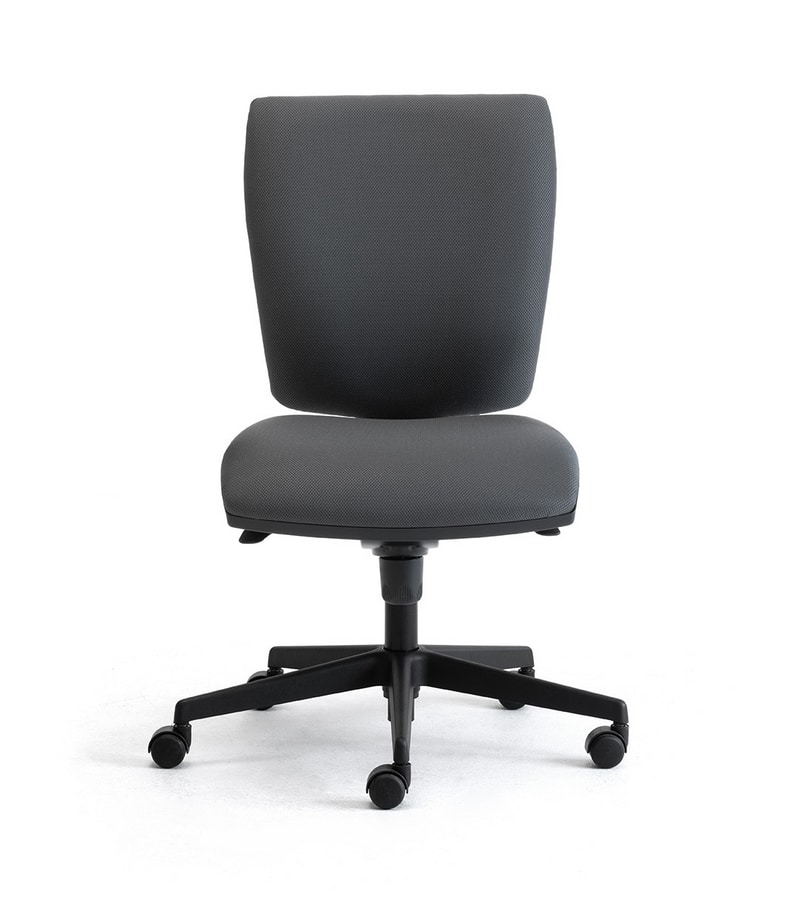 Chaise de bureau de travail. Le rembourrage est en mousse d'uréthane et élargi la couverture peut être choisi parmi les collections de tissus disponibles, la base de 5-étoiles est en nylon noir, les roulettes sont en nylon noir (type H) avec l'auto-système de freinage, les accoudoirs sont fixés ou avec réglage en hauteur, ce modèle est disponible dans la version de travail avec ou sans armes.