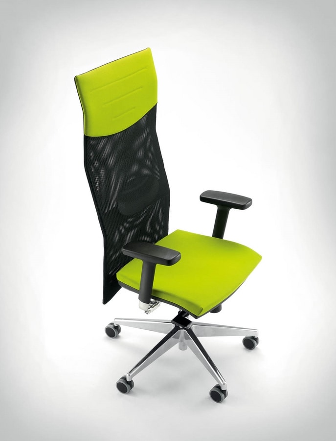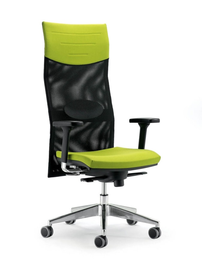Chaise opérationnelle avec dossier haut en maille et base en aluminium sur des roues. Disponible en différentes couleurs et accoudoirs réglables. Equipé de déplacement latéral et le mécanisme de syncro. chaise solide avec des formes carrées, made in Italy.