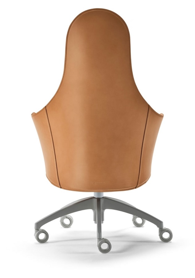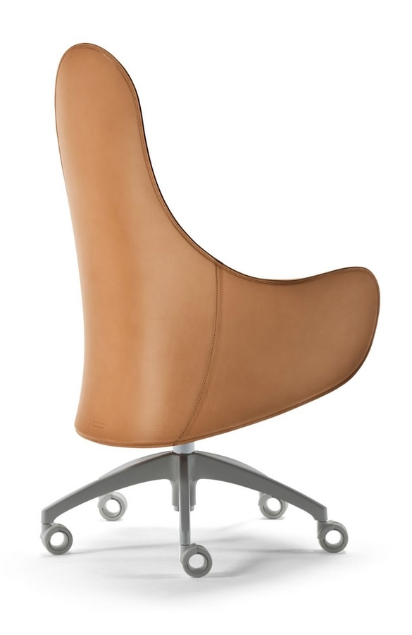 Fauteuil de bureau à roulettes. Coque rigide en polyuréthane à l'extérieur; intérieur en polyuréthane souple moulé à froid. Couvrant en cuir.