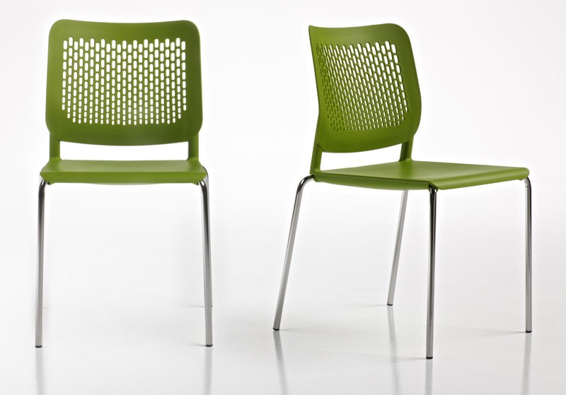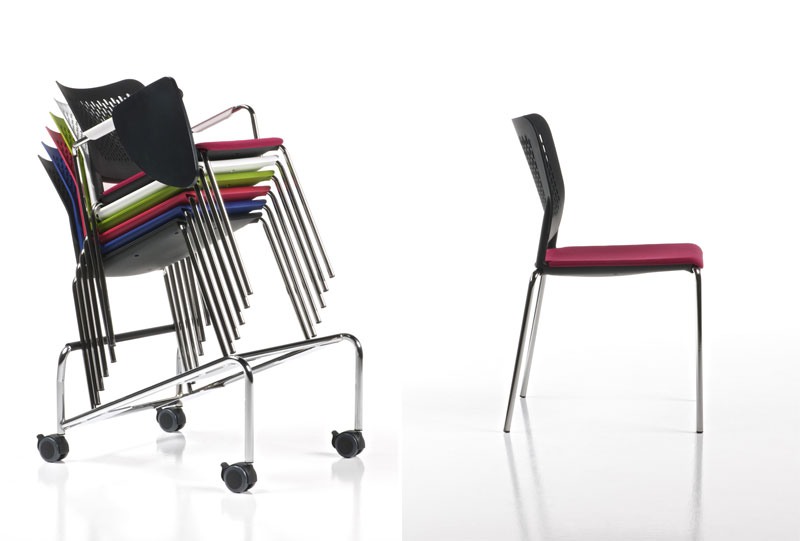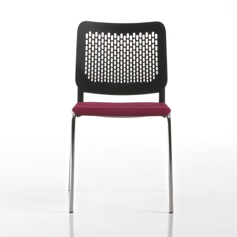 Chaise visiteur, en polypropylène. Structure en acier chromé, 4 pieds. Optional: seance rembourré en polyuréthane, accoudoirs et tablette écritoire. Empilable.