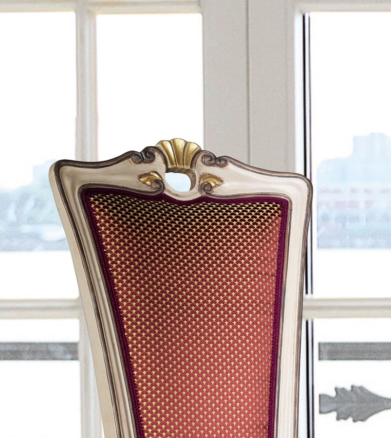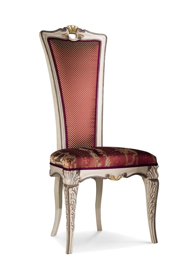 Chaise de salle à manger de style classique, avec siège farci et arrière et dos en tissu. Structure en bois ornée de sculptures artisanales.